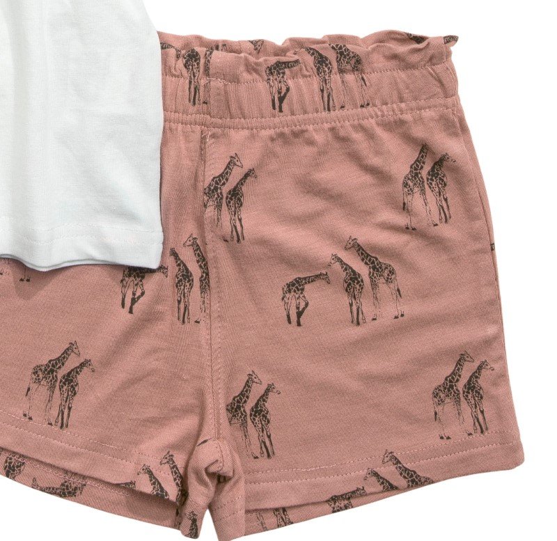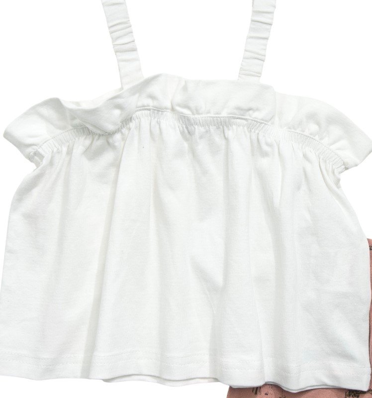 Σετ σορτς για bebe κορίτσι από 1 έως 6 ετών, μπλούζα με τιράντες σε εκρού χρώμα και σορτς σε ανοιχτό κεραμυδί χρώμα με ολόσωμο τύπωμα με λάστιχο. Ποιότητα 95% cotton-5% lycra.