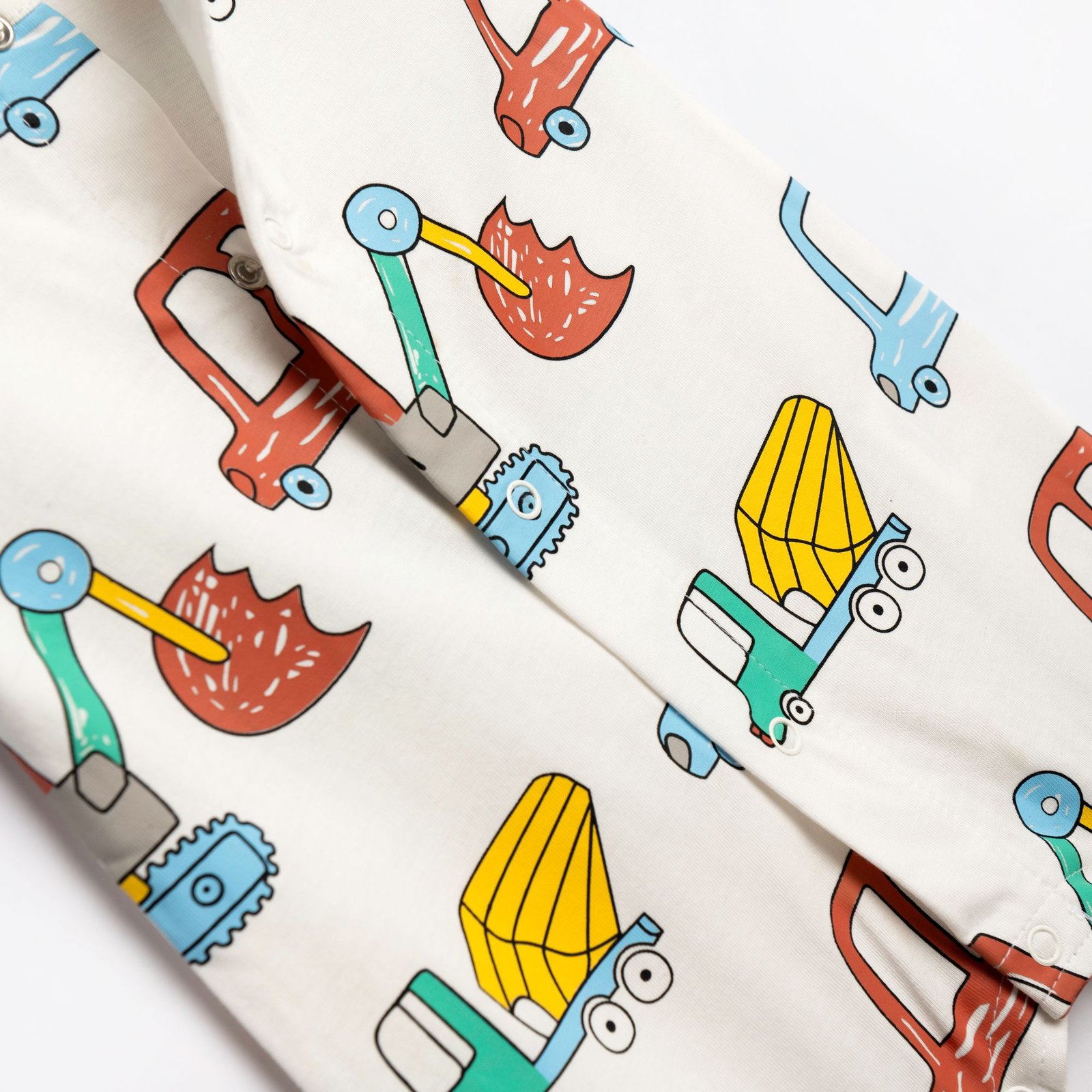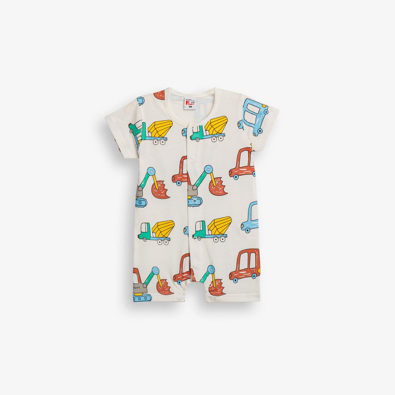 Φορμάκι κοντομάνικο κάλτσα με τύπωμα (οχήματα) allover σε χρώμα εκρού για αγόρι βρεφανάπτυξη . Ποιότητα 100% COTTON