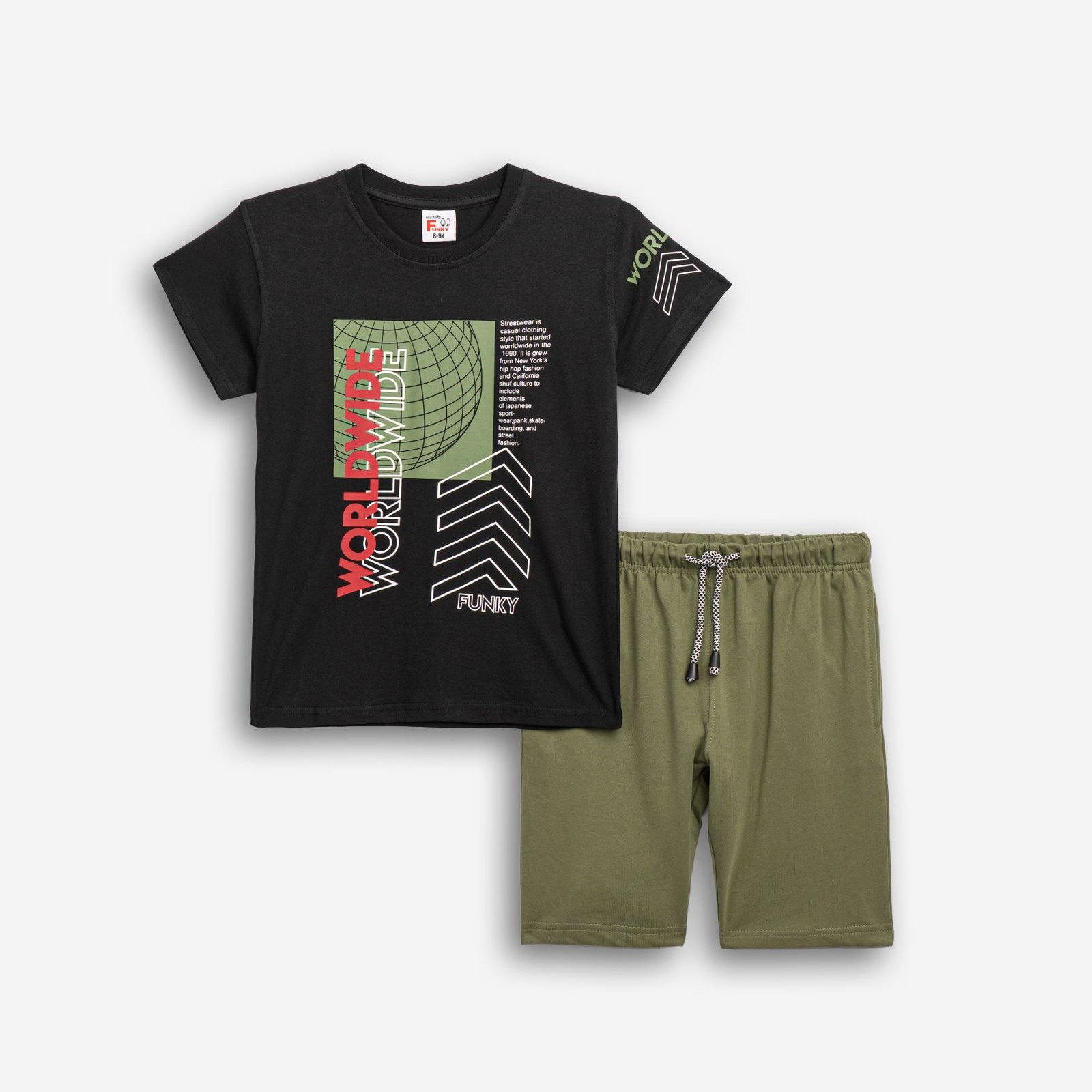 Σετ μακό κοντομάνικη μπλούζα με τύπωμα (worldwide) και βερμούδα σε χρώμα μαύρο/χακί για αγόρι 6-16 ετών. Ποιότητα 100% cotton.