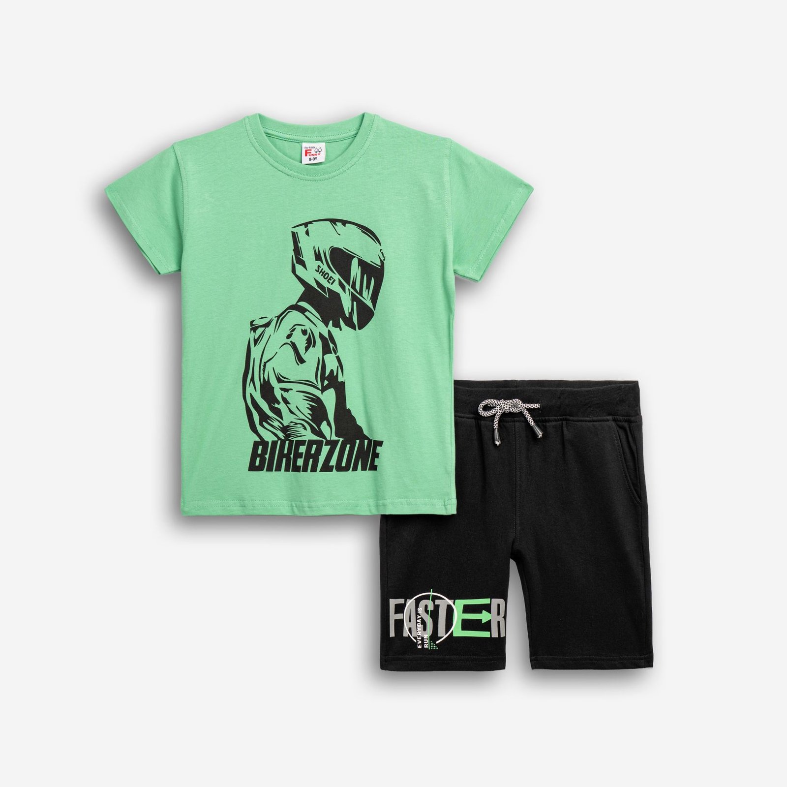 Σετ μακό κοντομάνικη μπλούζα με τύπωμα (bikerzone) και βερμούδα σε χρώμα πράσινο παπαγάλου/μαύρο για αγόρι 6-16 ετών. Ποιότητα 100% cotton.