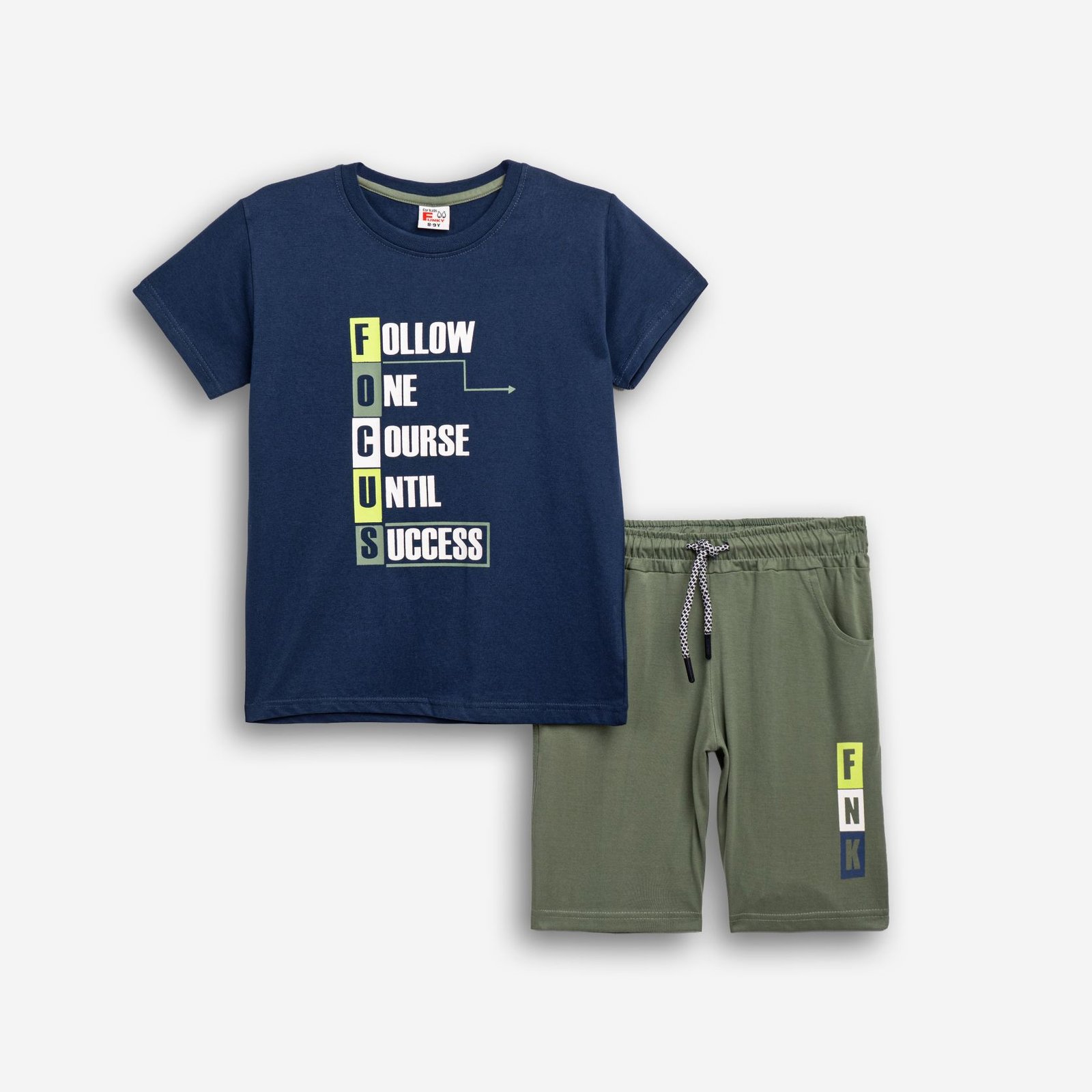 Σετ κοντομάνικη μπλούζα με τύπωμα (focus) και βερμούδα φούτερ με τύπωμα σε χρώμα ίντιγκο/χακί για αγόρι 6-16 ετών