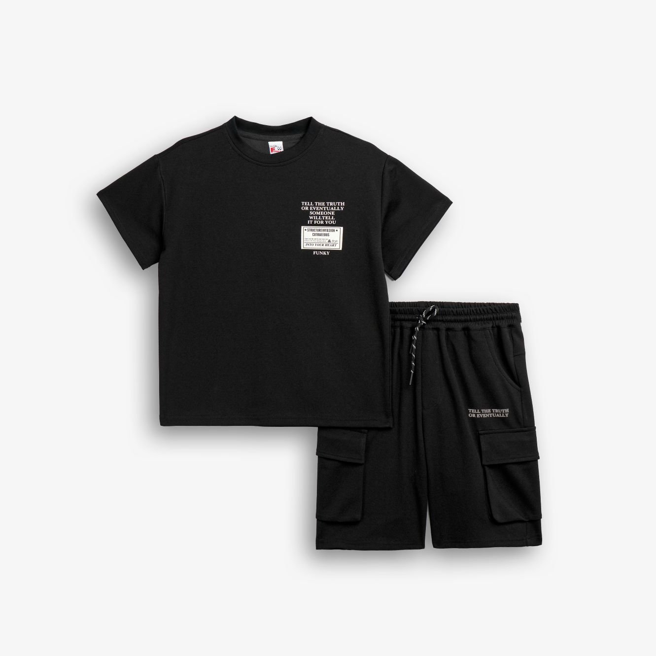 Σετ κοντομάνικη μπλούζα με τύπωμα (γράμματα) και βερμούδα με τύπωμα σε χρώμα μαύρο/μαύρο για αγόρι 6-16 ετών . Ποιότητα 42% COTTON-53% POLYESTER-5% ELASTAN.