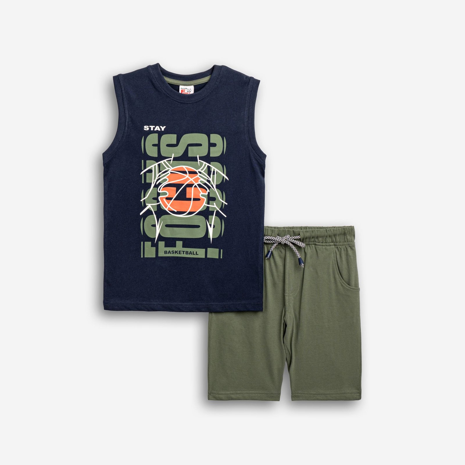 Σετ μακό αμάνικο με τύπωμα (focus-μπάλα μπάσκετ) και βερμούδα σε χρώμα μπλέ/χακί για αγόρι 6-16 ετών