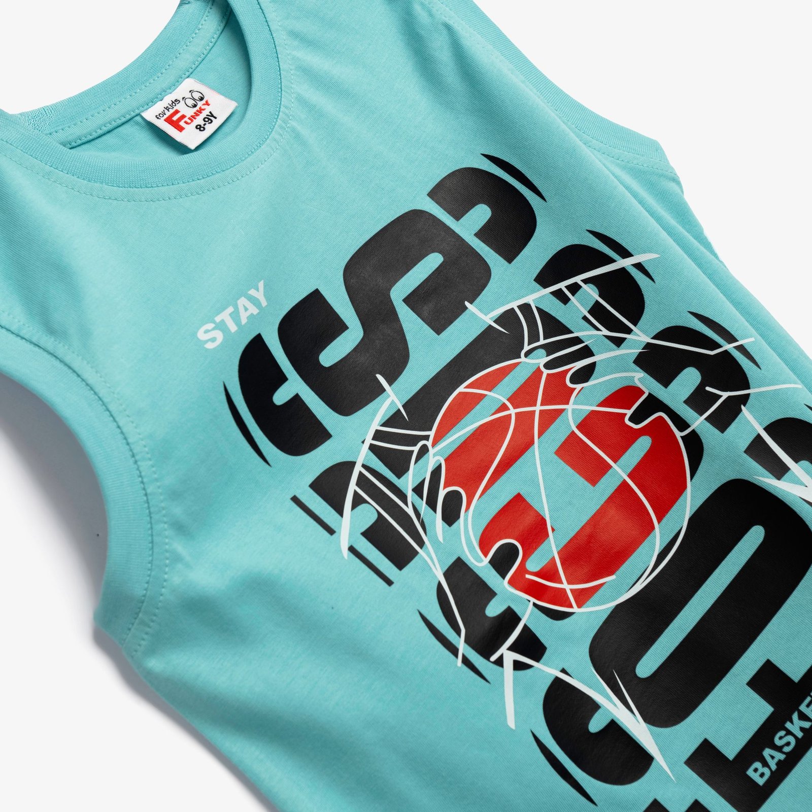 Σετ μακό αμάνικο με τύπωμα (focus-μπάλα μπάσκετ) και βερμούδα σε χρώμα τυρκουάζ/μαύρο για αγόρι 6-16 ετών