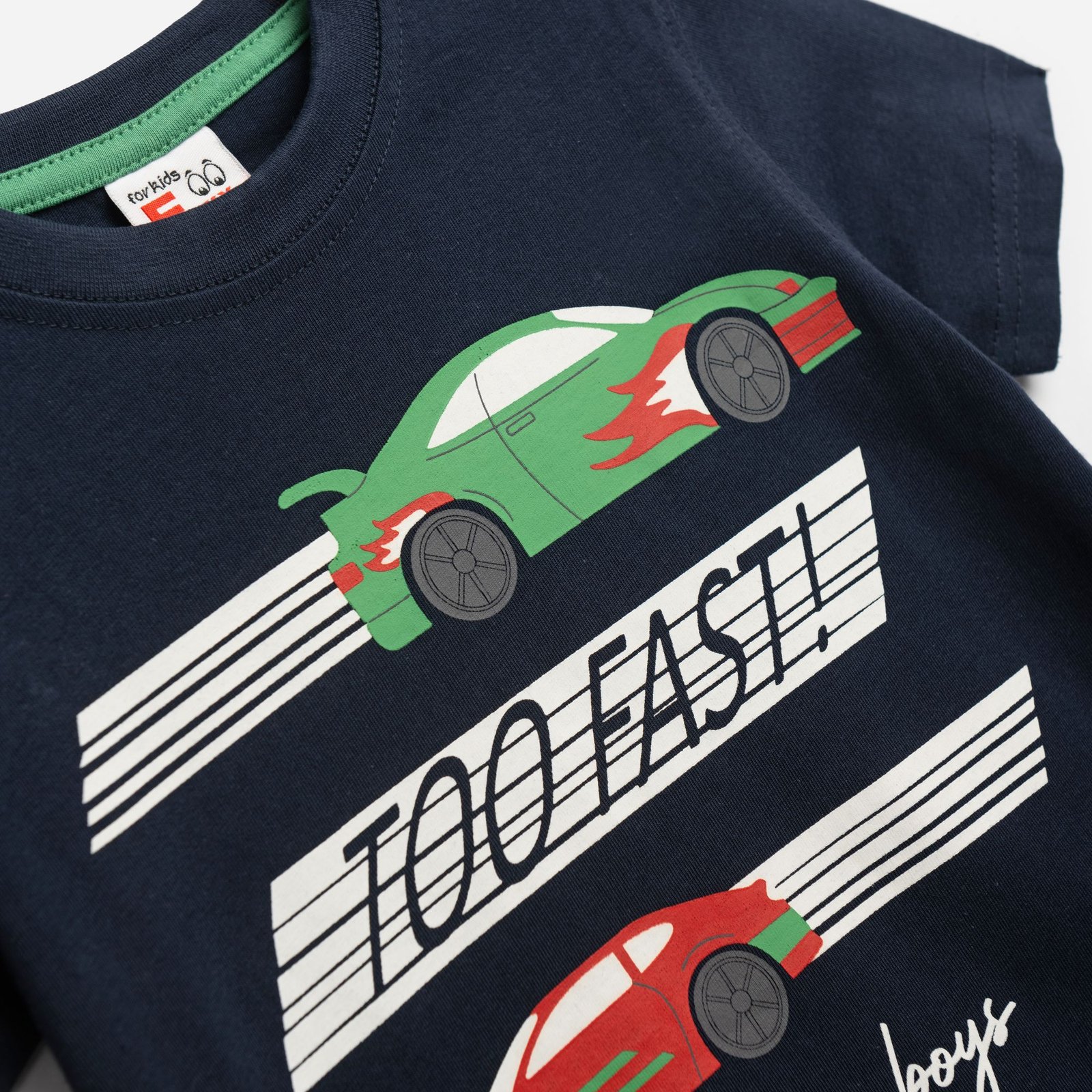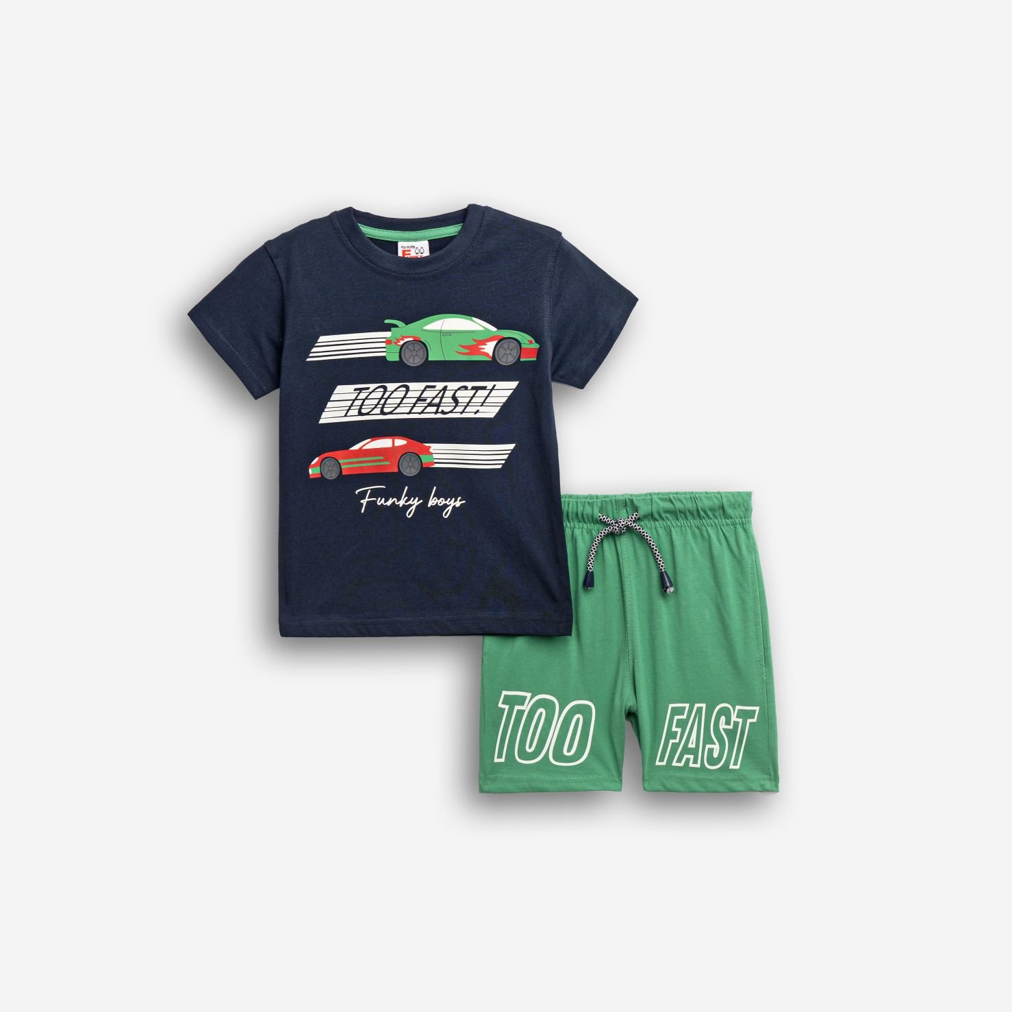 Σετ μπλούζα μακό με τύπωμα (too fast) και βερμούδα πάνω από το γόνατο με τύπωμα σε χρώμα μπλέ/leprechaun για αγόρι 1-6 ετών. Ποιότητα 100% COTTON.