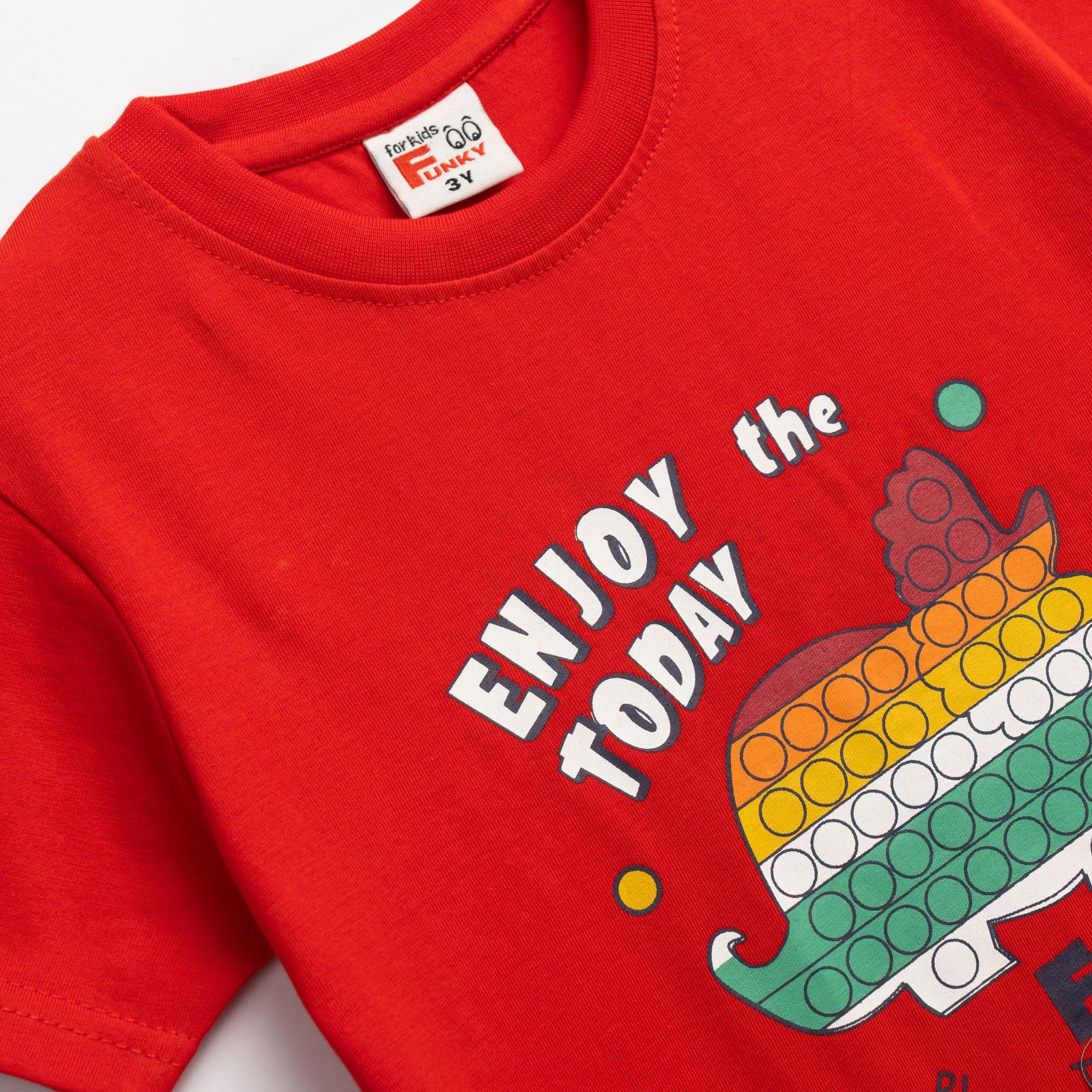Σετ μπλούζα μακό με τύπωμα (enjoy the day) και βερμούδα πάνω από το γόνατο σε χρώμα κόκκινο/μπλέ για αγόρι 1-6 ετών . Ποιότητα 100% COTTON.