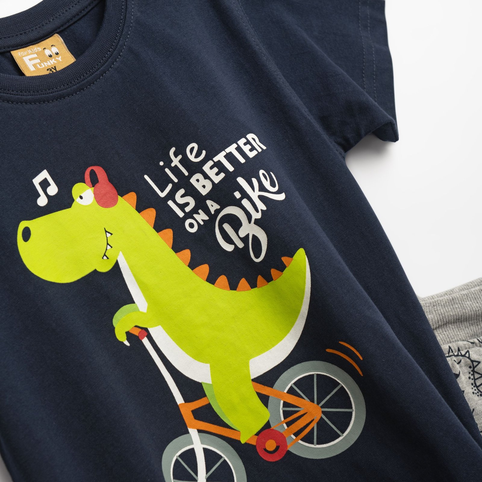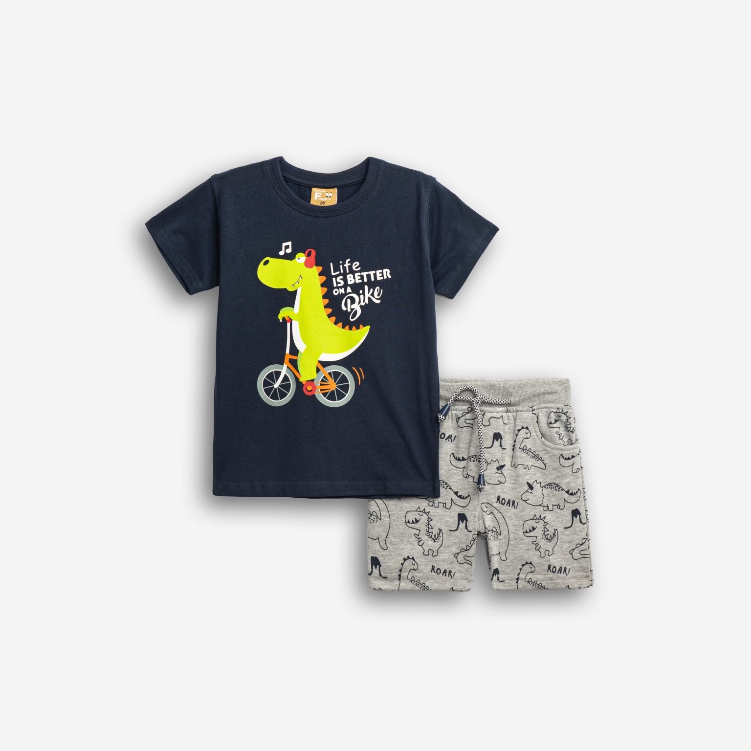 Σετ μπλούζα με τύπωμα (δεινόσαυρος) και βερμούδα φούτερ πάνω από το γόνατο με τύπωμα allover σε χρώμα μπλέ/γκρί μελανζέ για αγόρι 1-6 ετών . Ποιότητα 100% COTTON.