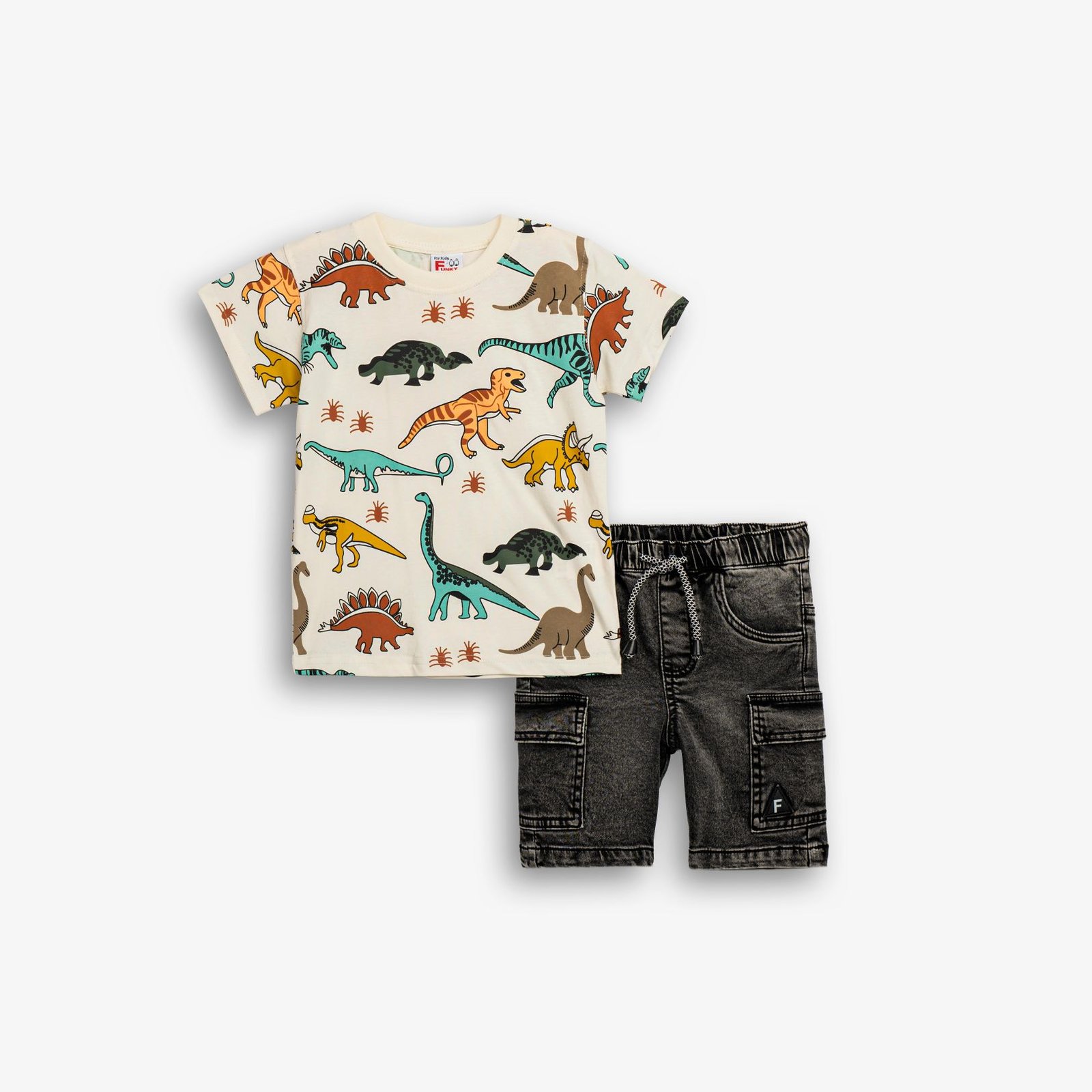 Σετ μπλούζα με τύπωμα (δεινόσαυροι) allover και βερμούδα φούτερ τζίν πάνω από το γόνατο σε χρώμα εκρού/μαύρο τζίν για αγόρι 1-6 ετών. Ποιότητα 100% COTTON+98% COTTON-2% ELASTAN
