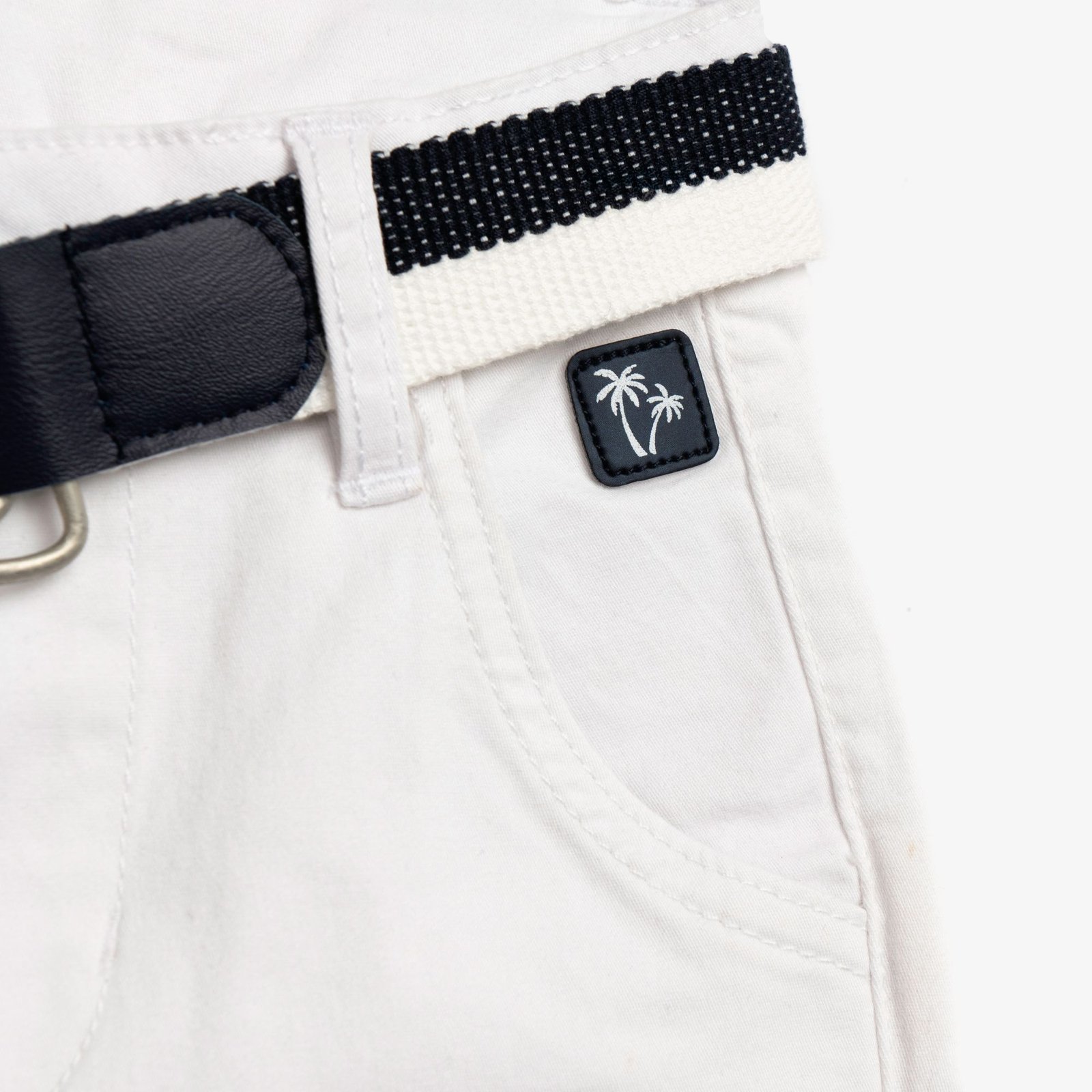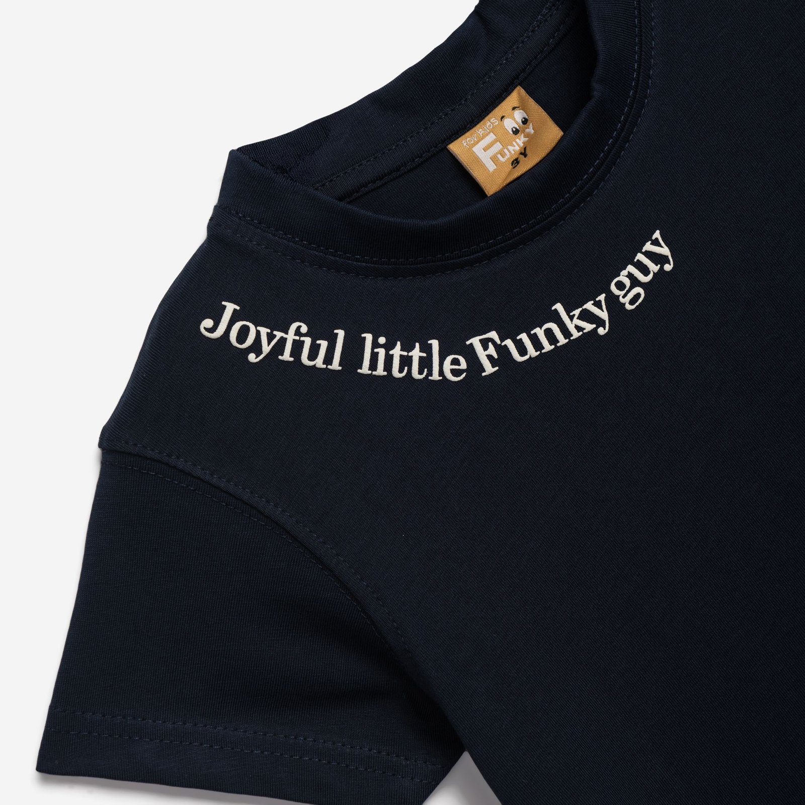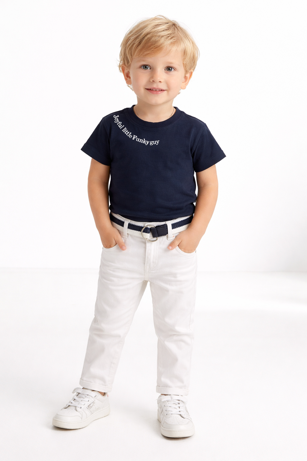 Σετ μπλούζα κοντομάνικη κάλτσα με τύπωμα (joyful little funky guy) σε χρώμα μπλε και παντελόνι ( ελαστικό ) με ζώνη σε χρώμα λευκό για αγόρι 1 έως 6 ετών . Ποιότητα 100% COTTON+98%COTTON-2% ELASTAN.