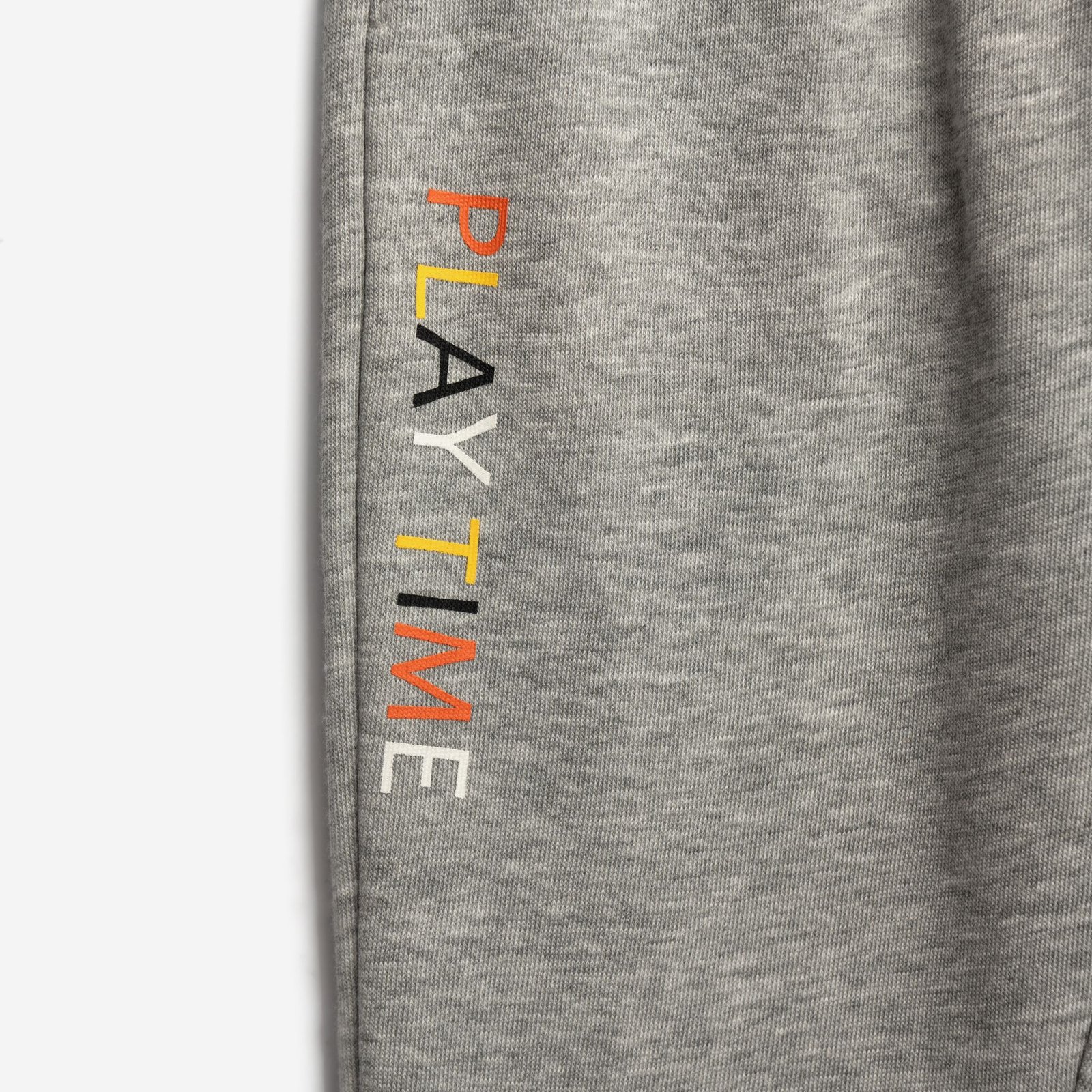 Φόρμα φούτερ με τύπωμα (play time) σε χρώμα ανθρακί / γκρι μελανζέ για αγόρι 1-6 ετών. Ποιότητα 100% cotton.