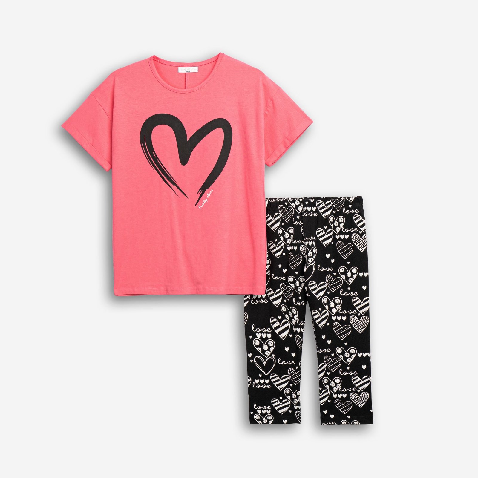 Μπλουζοφόρεμα με τύπωμα (καρδιές) και κολάν κάλτσα κάπρι λύκρα με τύπωμα allover σε χρώμα φλαμίγκο/μαύρο για κορίτσι 6-16 ετών. Ποιότητα 95% COTTON-5% ELASTAN