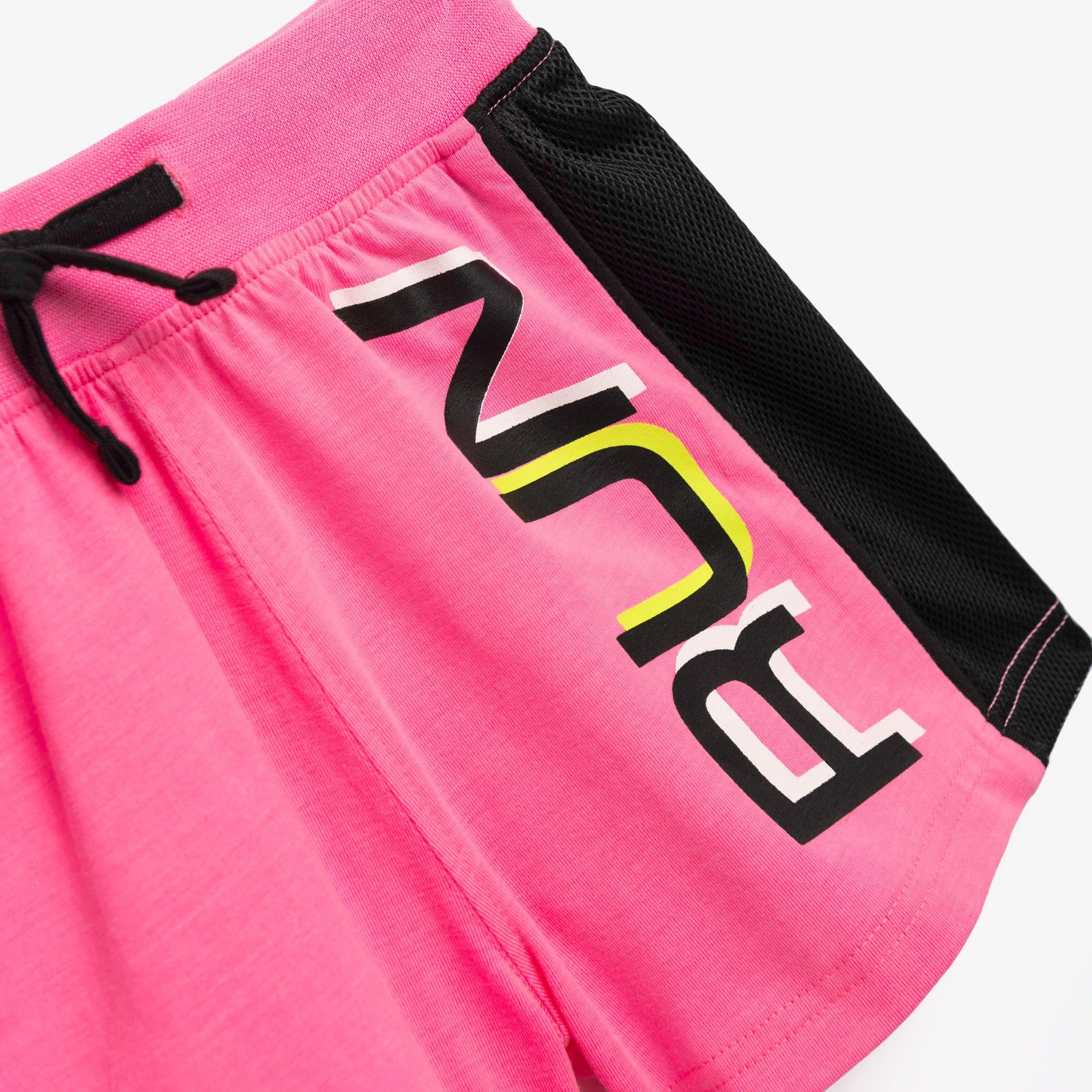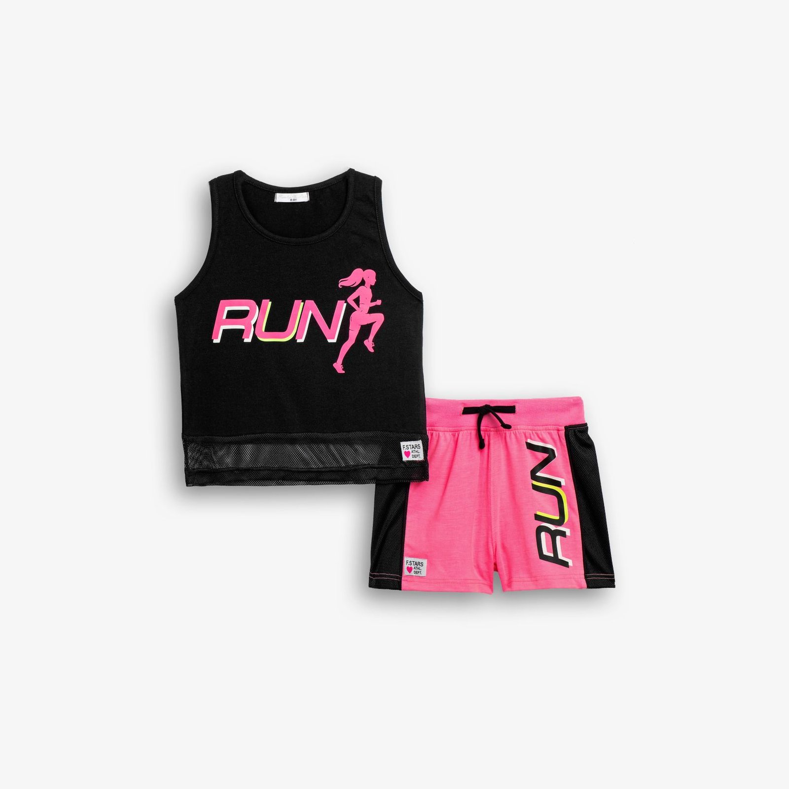 Σετ μπλουζάκι με τύπωμα (run) και σόρτς κάλτσα λύκρα με τύπωμα σε χρώμα μαύρο/φωσφορούχο ρόζ για κορίτσι 6-16 ετών. Ποιότητα 95% COTTON-5% ELASTAN