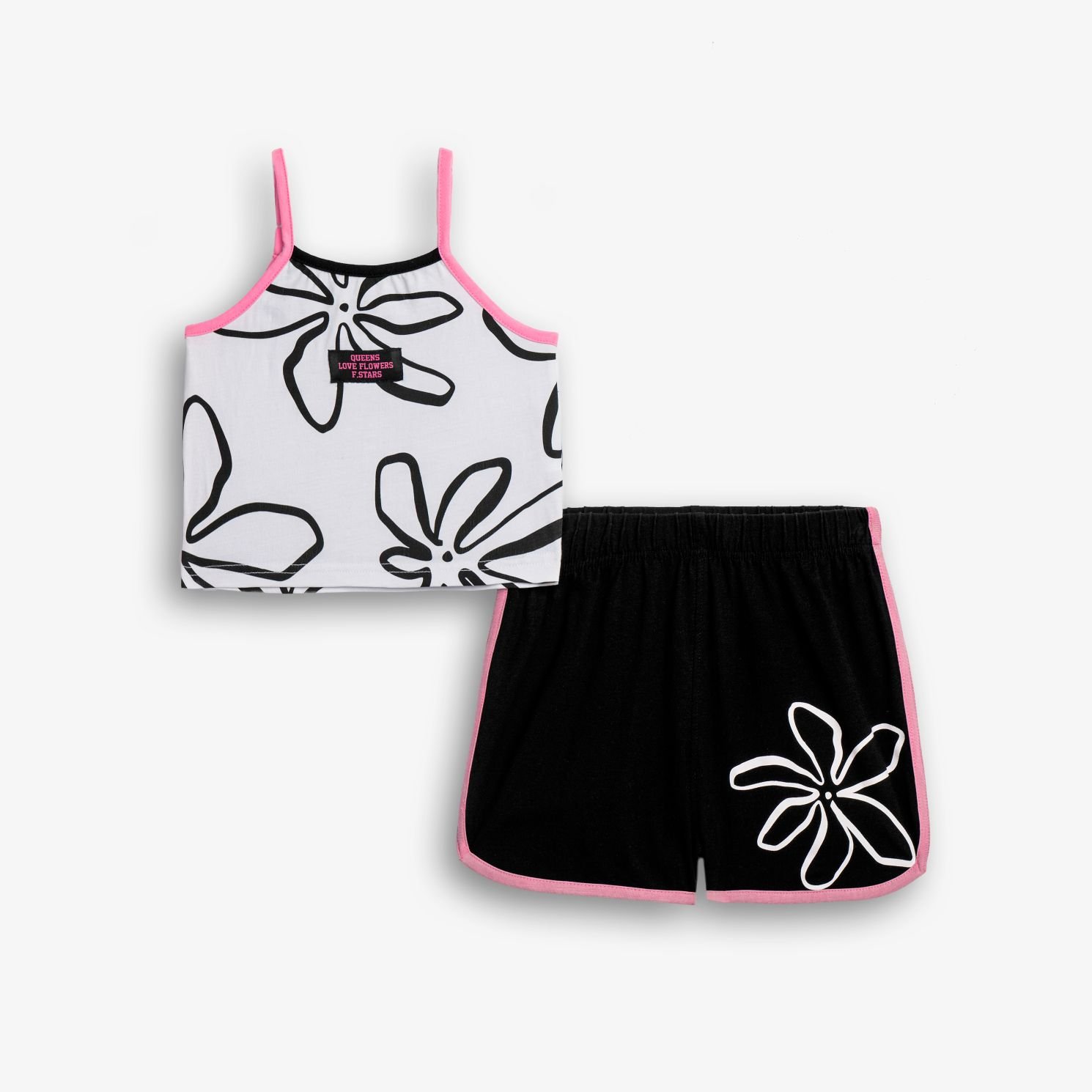 Σετ μπλουζάκι με τύπωμα (λουλούδι) allover και σόρτς κάλτσα λύκρα με τύπωμα σε χρώμα λευκό/μαύρο για κορίτσι 6-16 ετών. Ποιότητα 95% COTTON-5% ELASTAN
