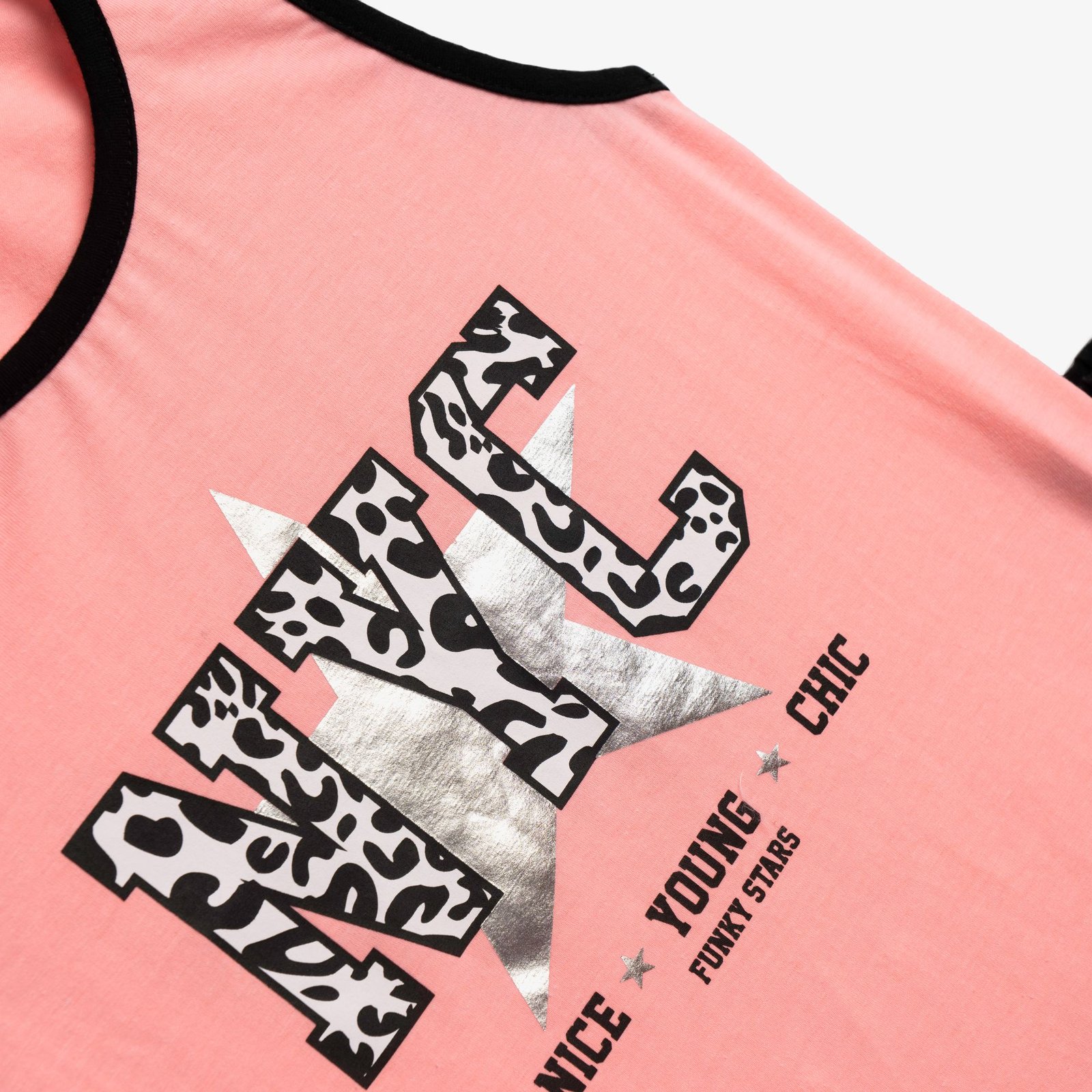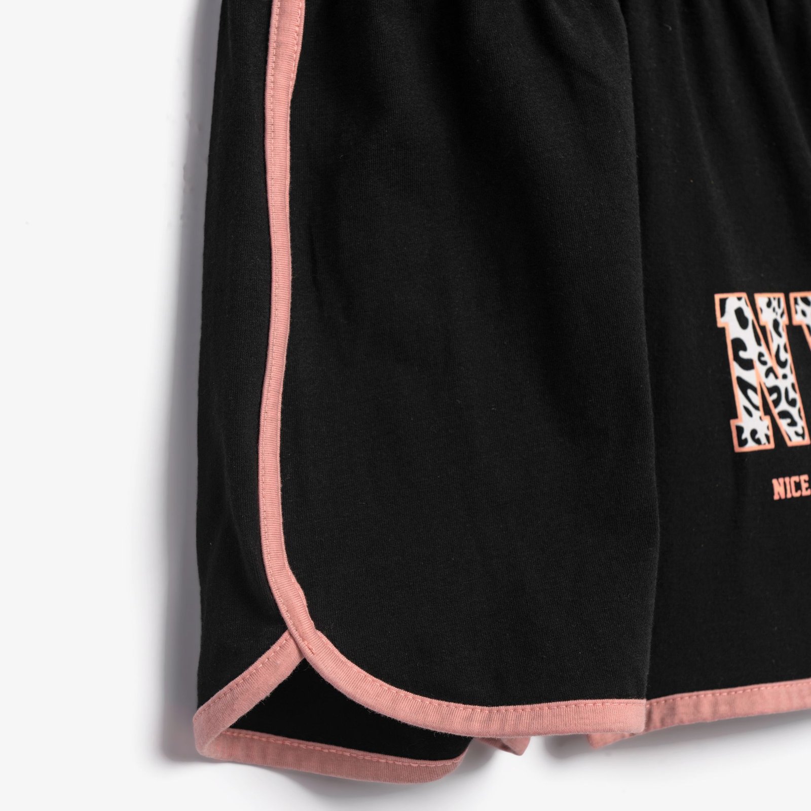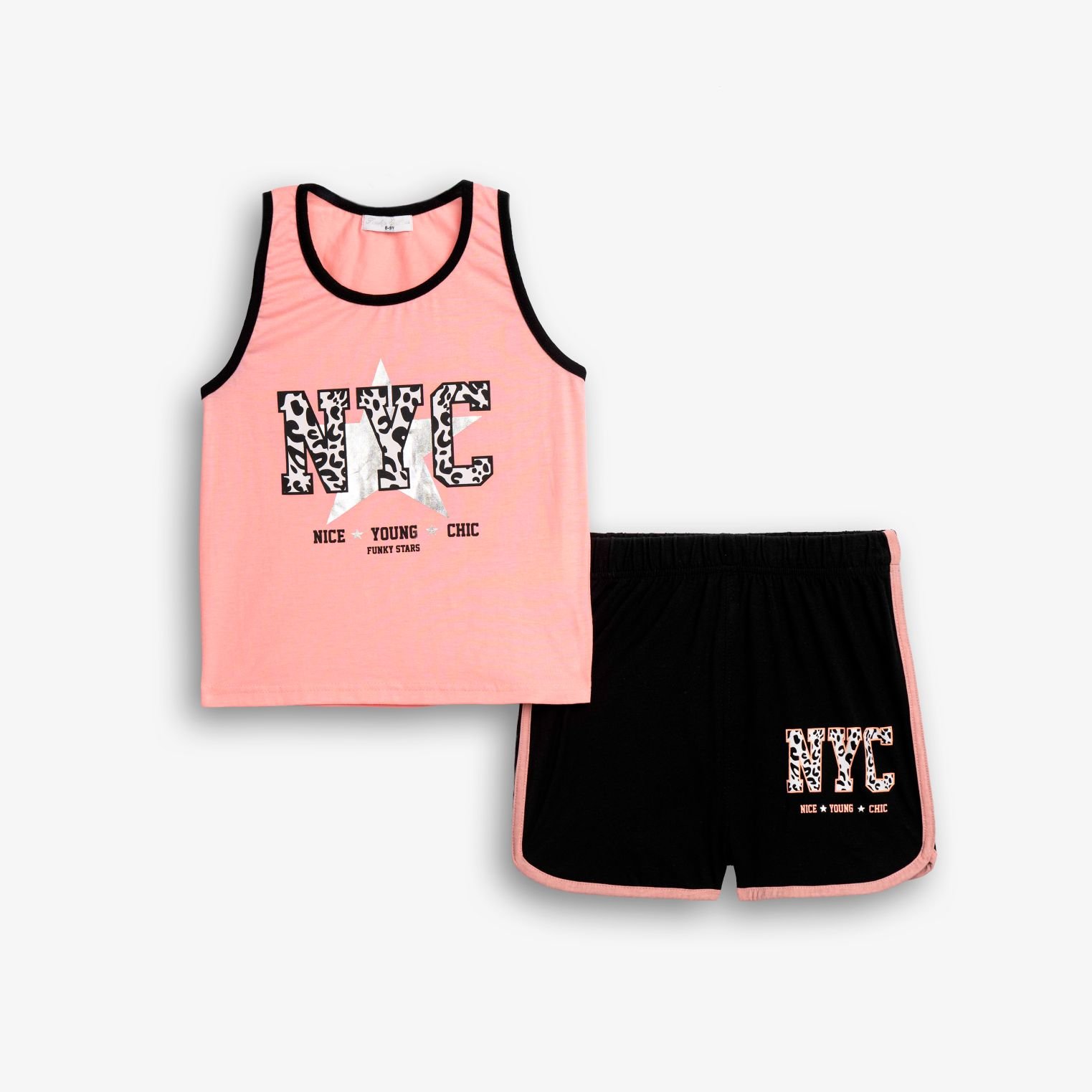 Σετ μπλουζάκι με τύπωμα (NYC) και σόρτς κάλτσα λύκρα με τύπωμα σε χρώμα φωσφορούχο ανοιχτό σομόν/μαύρο για κορίτσι 6-16 ετών. Ποιότητα 95% COTTON-5% ELASTAN
