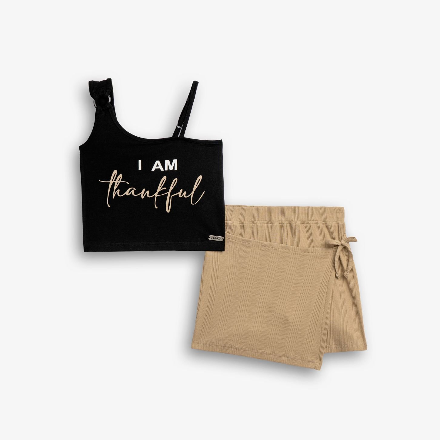 Σετ μπλουζά κάλτσα λύκρα με τύπωμα (I am thankfull) και σόρτς ριπ σε χρώμα μαύρο/μόκα για κορίτσι 6-16 ετών . Ποιότητα 95% COTTON-5% ELASTAN