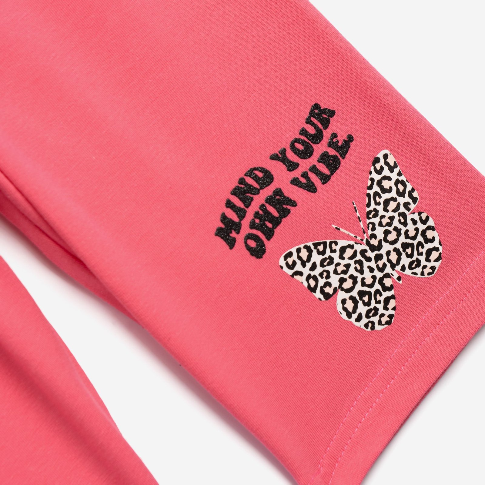 Σετ μπλούζα κάλτσα λύκρα με τύπωμα (mind your own vibe) και κολάν ποδηλατικό με τύπωμα σε χρώμα φλαμίνγκο/φλαμίνγκο για κορίτσι 6-16 ετών . Ποιότητα 95% COTTON-5% ELASTAN