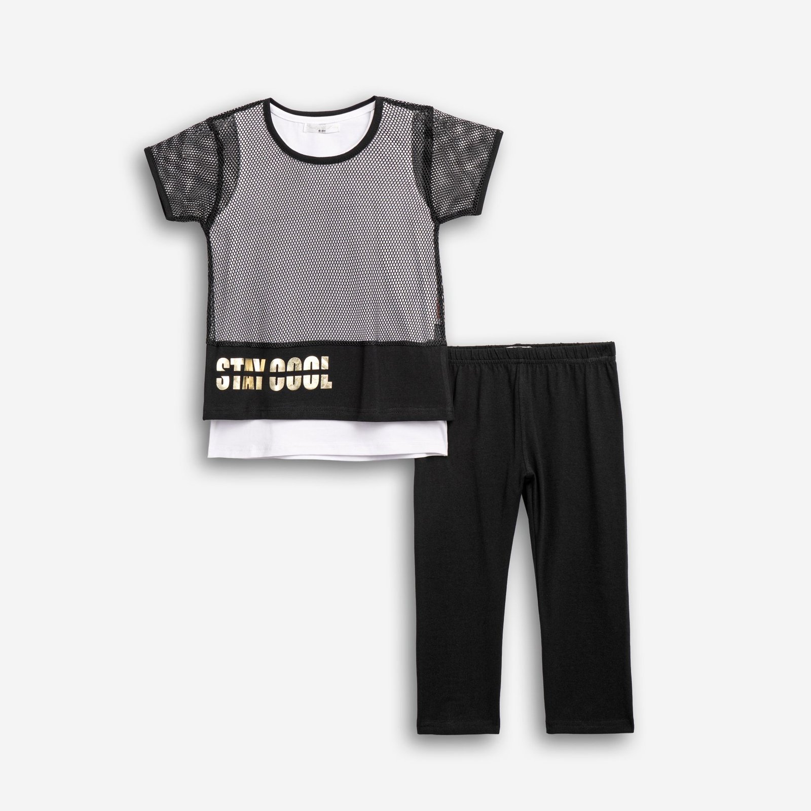 Σετ 3 τεμάχια μπλούζα δίχτυ με τύπωμα (stay cool) και μπλουζα και κολάν κάπρι κάλτσα λύκρα σε χρώμα μαύρο/λευκό/μαύρο για κορίτσι 6-16 ετών . Ποιότητα 95% COTTON-5% ELASTAN