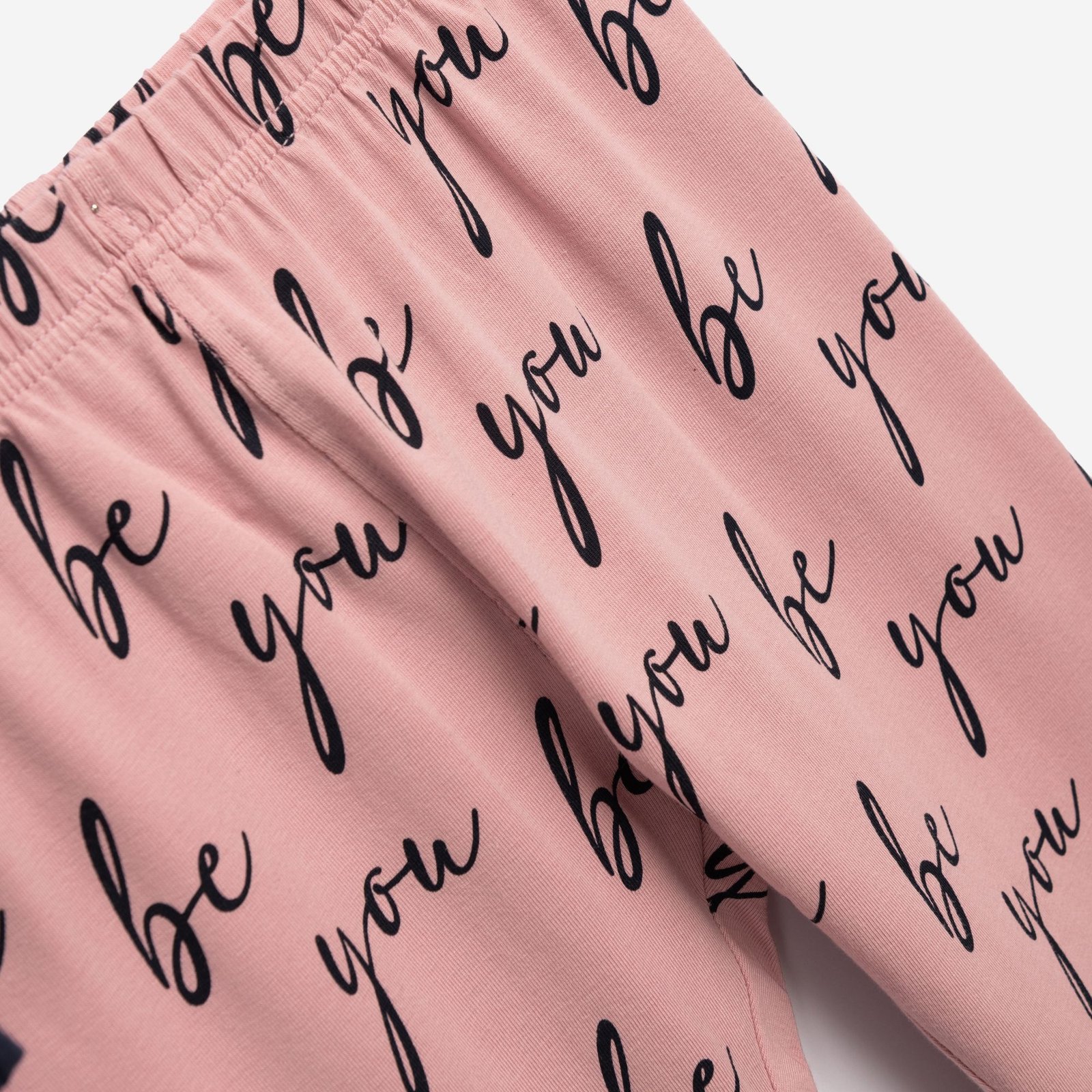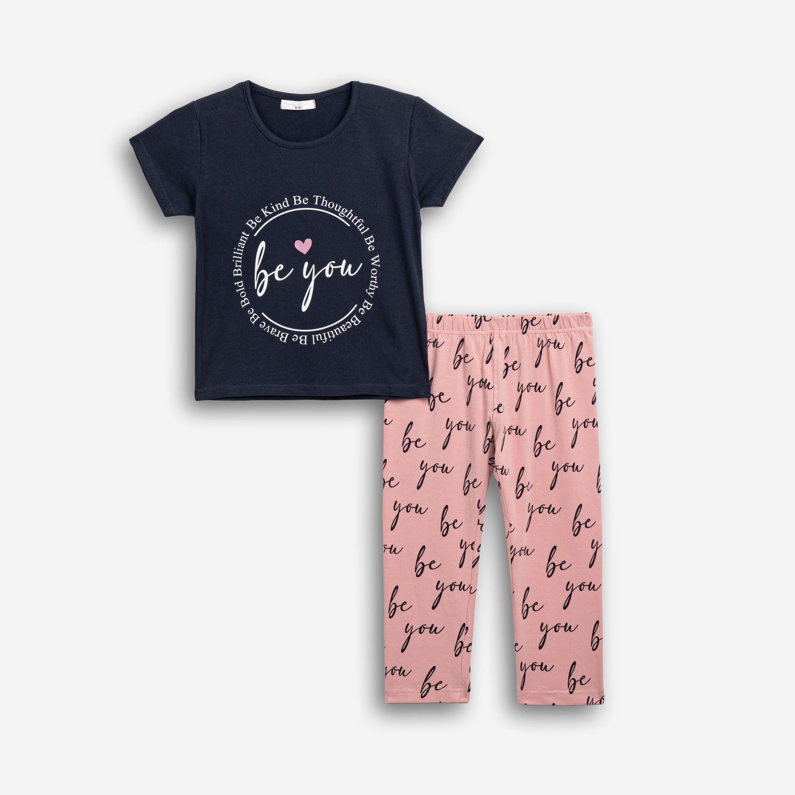Σετ μπλούζα με τύπωμα (be you) και κολάν κάπρι κάλτσα λύκρα με τύπωμα σε χρώμα μπλέ/άγριο τριαντάφυλλο για κορίτσι 6-16 ετών. Ποιότητα 95% COTTON-5% ELASTAN