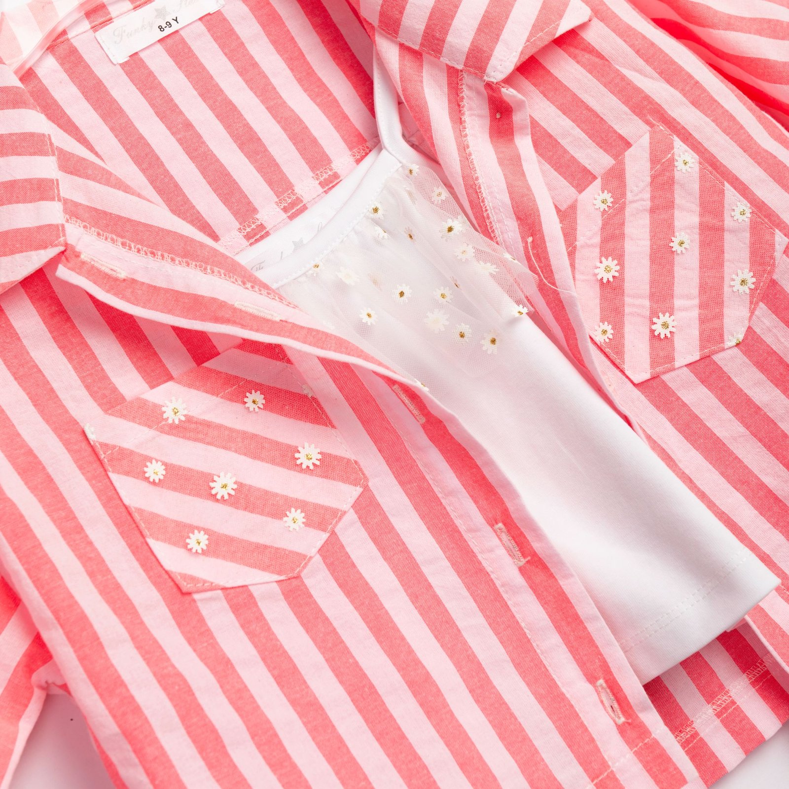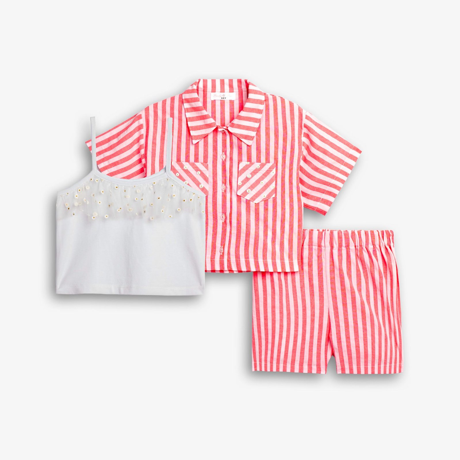 Σετ 3 τεμάχια πουκάμισο κοντομάνικο ριγέ και τοπ και σόρτς ριγέ σε χρώμα τύπος για κορίτσι 6-16 ετών . Ποιότητα 75% POLYESTER-25% COTTON.