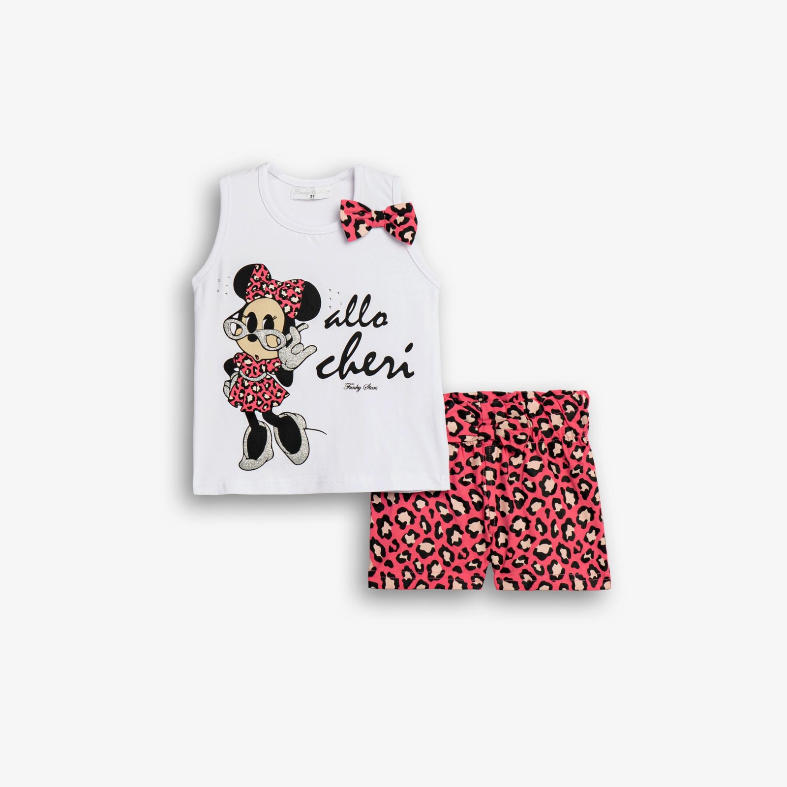 Σετ μπλούζα κάλτσα λύκρα με τύπωμα (minnie) και σόρτς με τύπωμα allover σε λευκό/φλαμίγκο για κορίτσι 1-6 ετών . Ποιότητα 95% COTTON+5% ELASTAN.