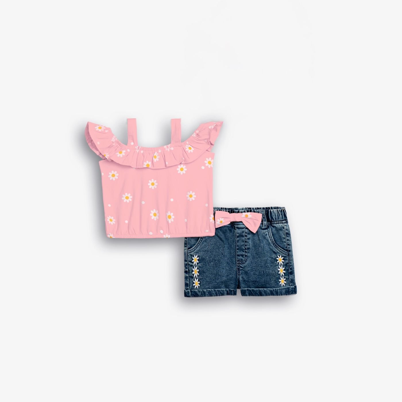 Σετ μπλούζα κάλτσα λύκρα με τύπωμα (λουλούδια) allover και σόρτς τζίν λύκρα σε χρώμα ροζ πούδρας/μπλέ τζίν για κορίτσι 1-6 ετών. Ποιότητα 95% COTTON-5% ELASTAN+98% COTTON-2% ELASTAN.