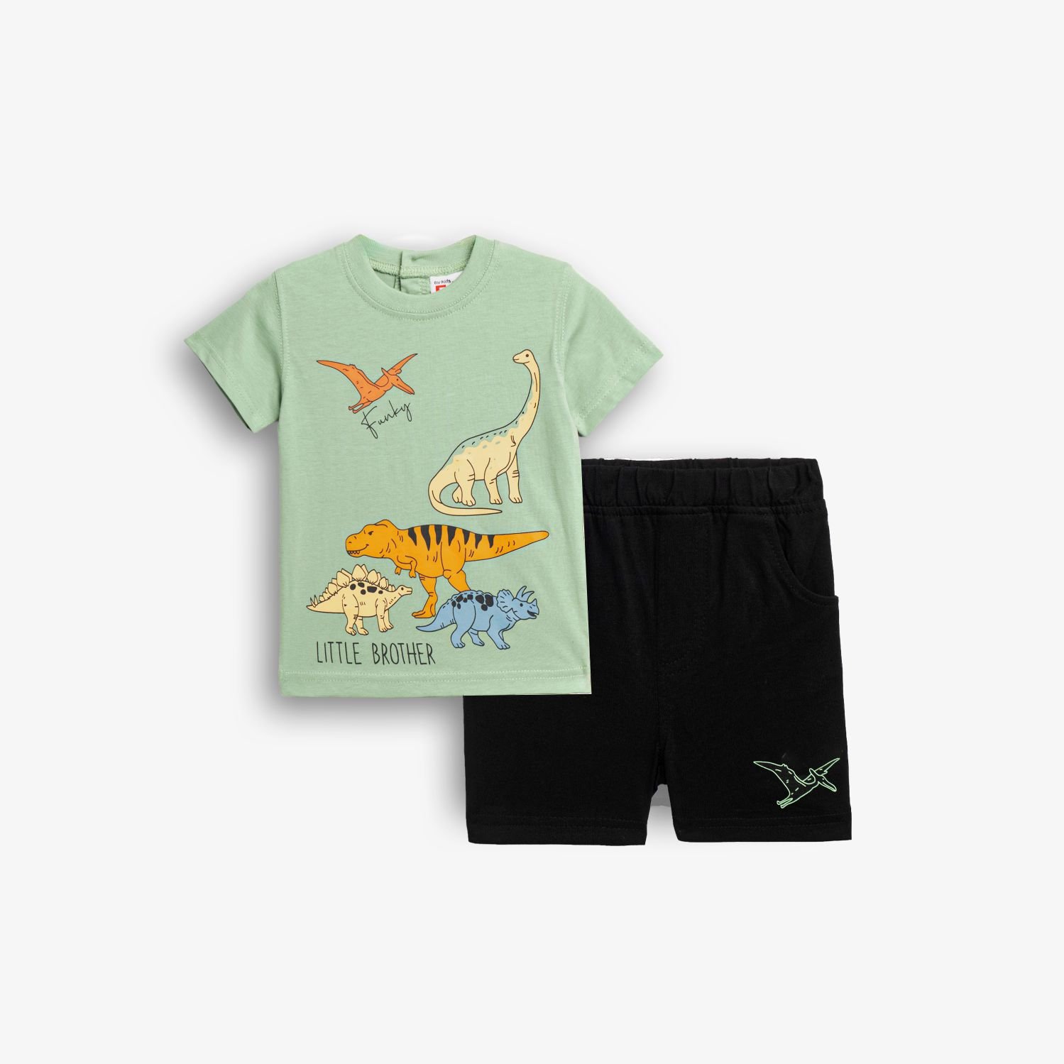 Σετ μπλούζα μακό με τύπωμα (δεινοσαυράκια) και σόρτς με τύπωμα σε χρώμα γρασίδι/μαύρο για αγόρι μηνών . Ποιότητα 100% cotton.