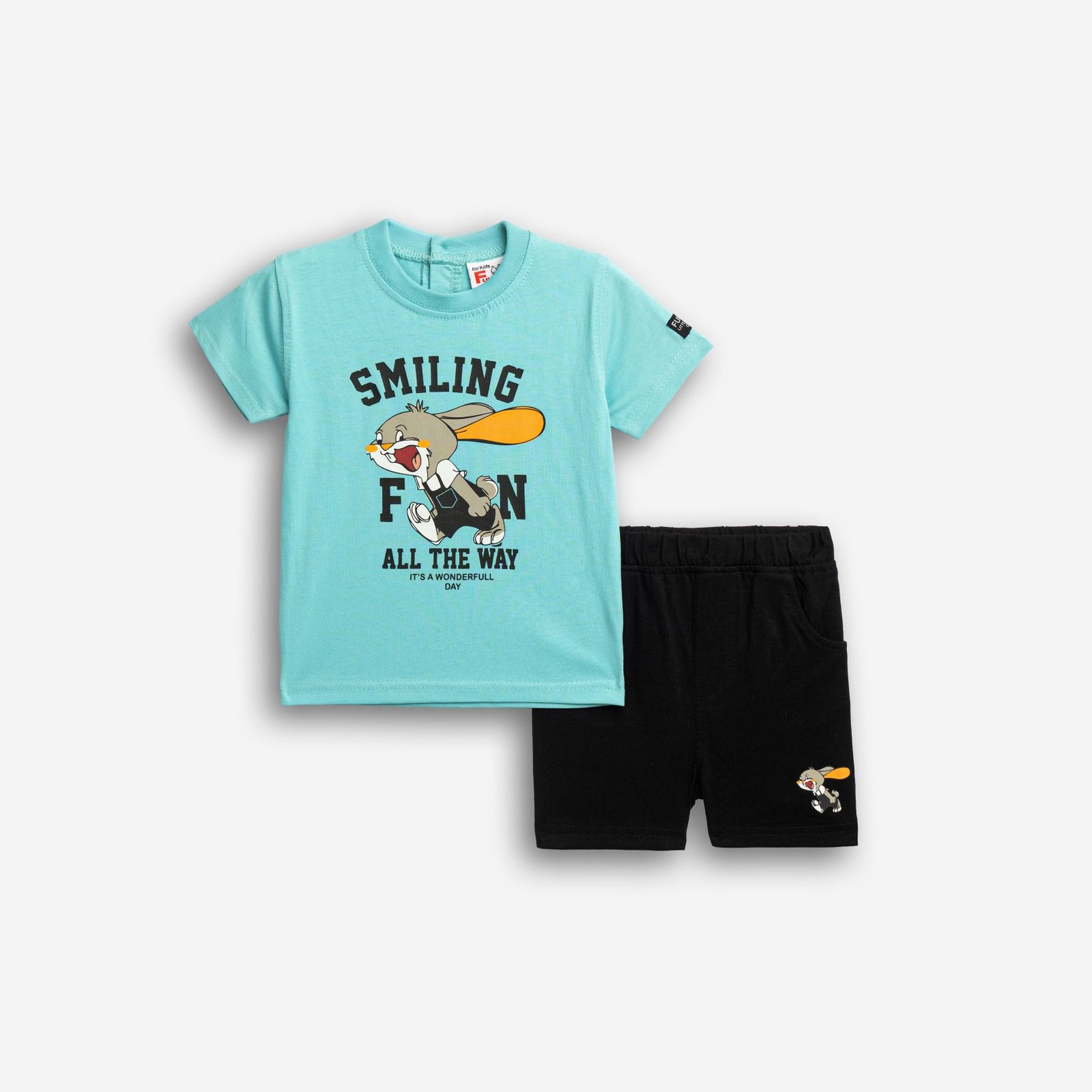 Σετ μπλούζα μακό με τύπωμα (λαγουδάκι) και σόρτς με τύπωμα σε χρώμα τυρκουάζ/μαύρο για αγόρι μηνών . Ποιότητα 100% cotton.