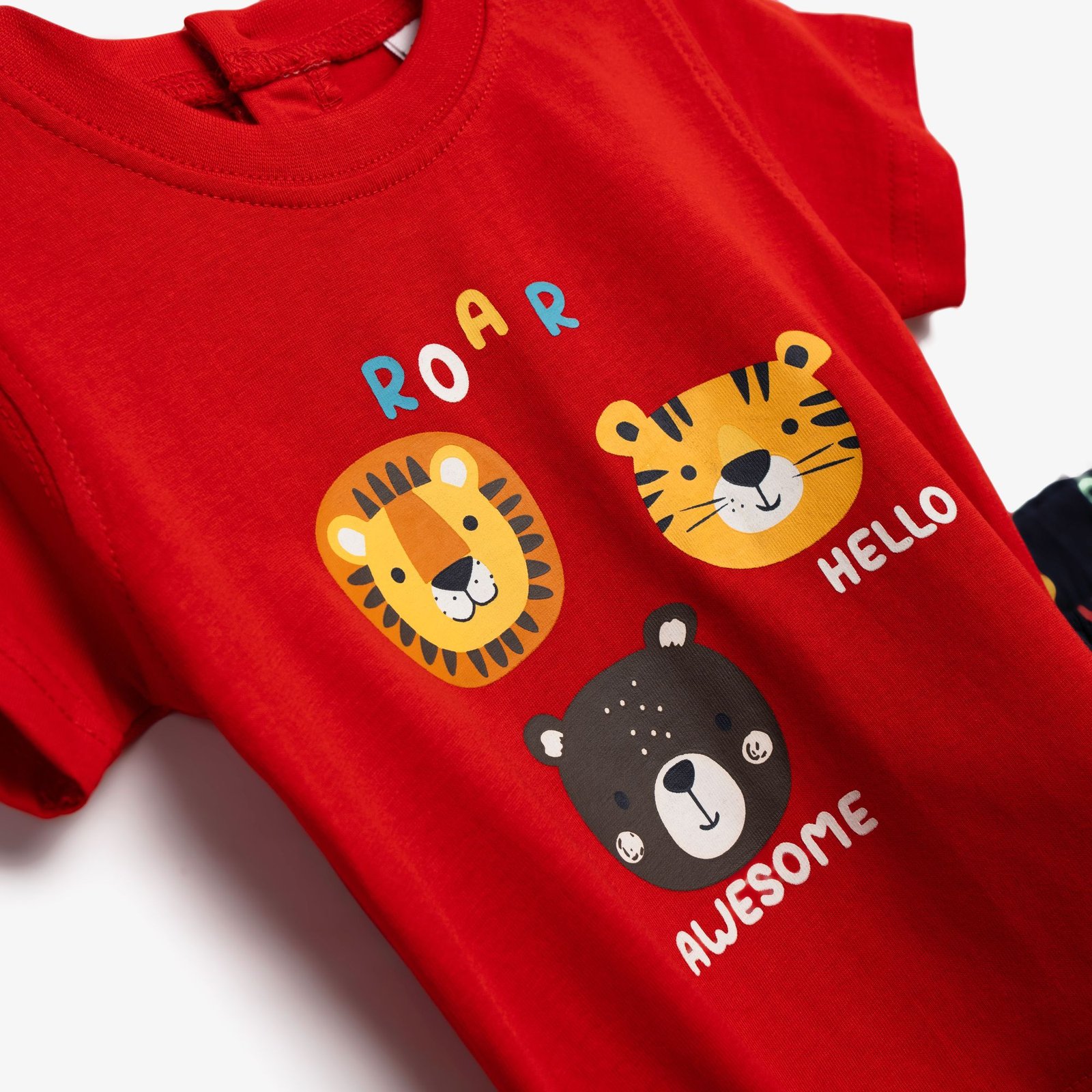 Σετ μπλούζα μακό με τύπωμα (ζωάκια) και σόρτς με τύπωμα allover σε χρώμα κόκκινο/μπλέ για αγόρι μηνών . Ποιότητα 100% cotton.