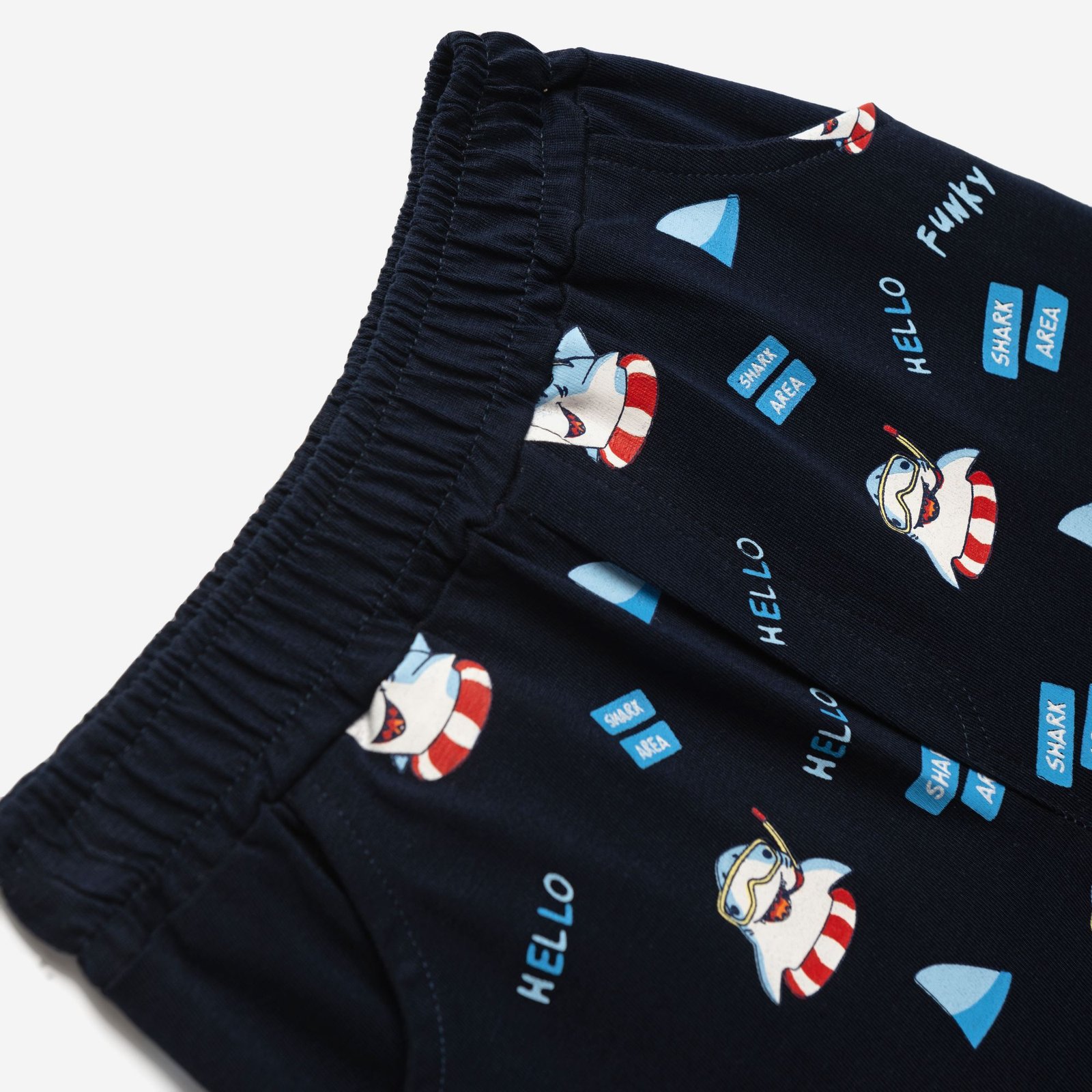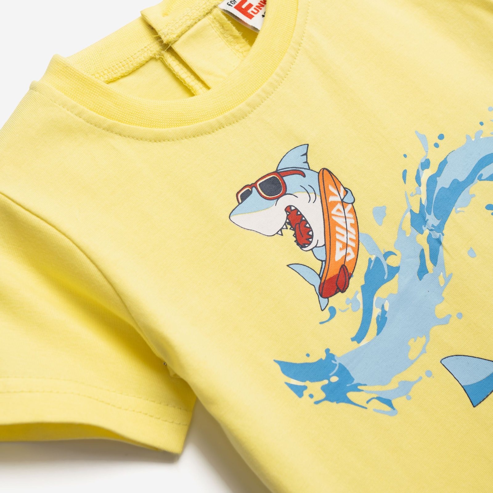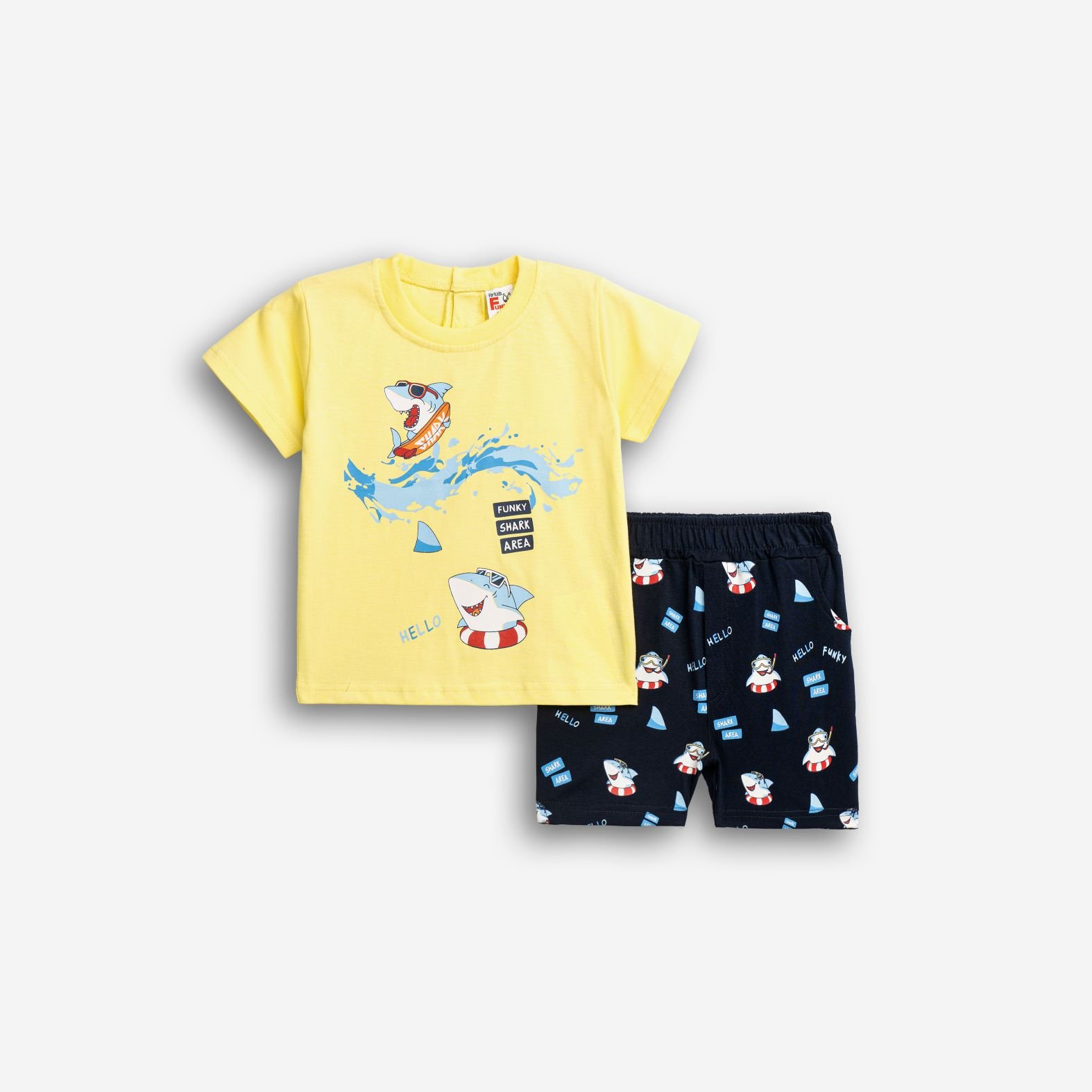 Σετ μπλούζα μακό με τύπωμα (καρχαρίες) και σόρτς με τύπωμα allover σε χρώμα ανοιχτό κίτρινο/μπλέ για αγόρι μηνών. Ποιότητα 100% COTTON.
