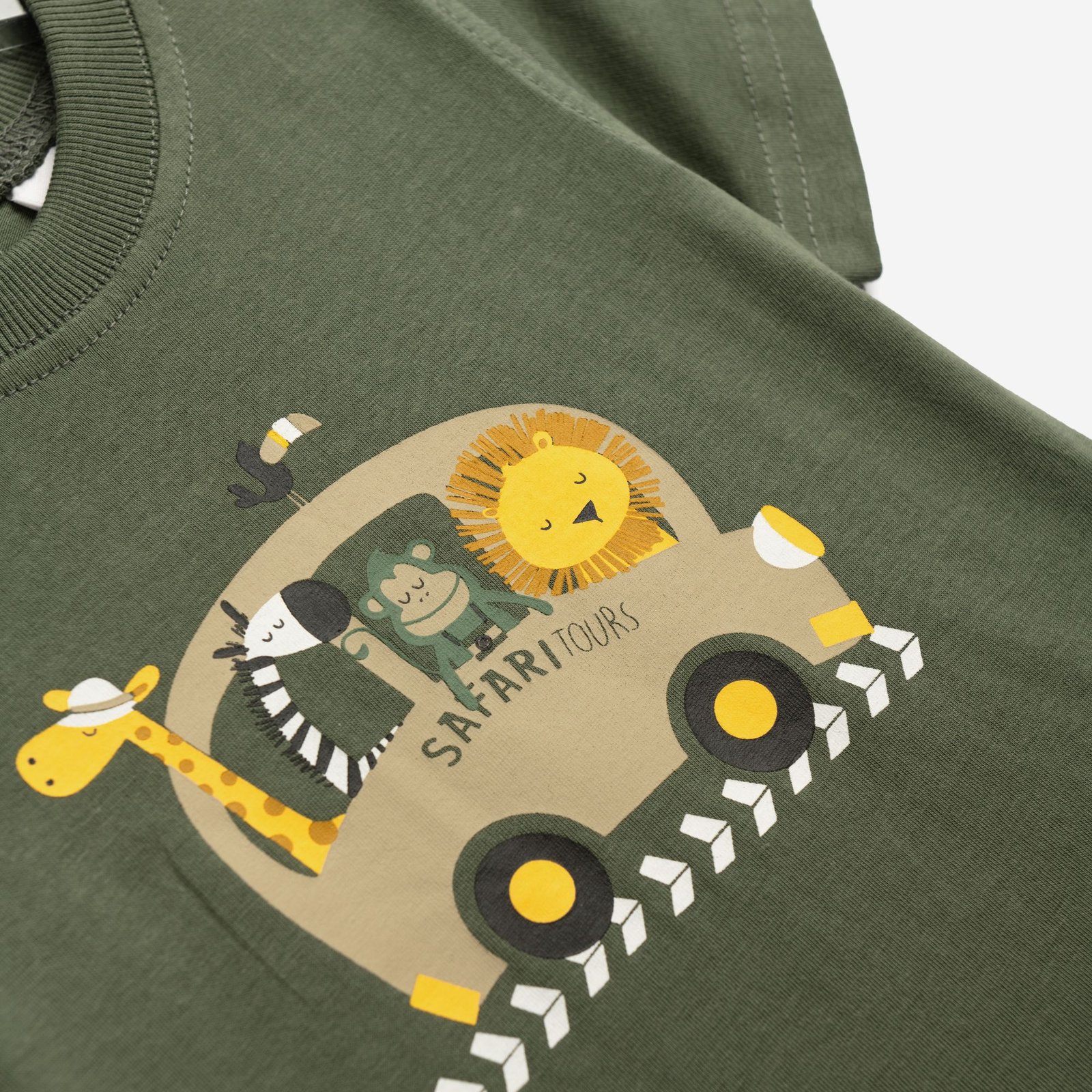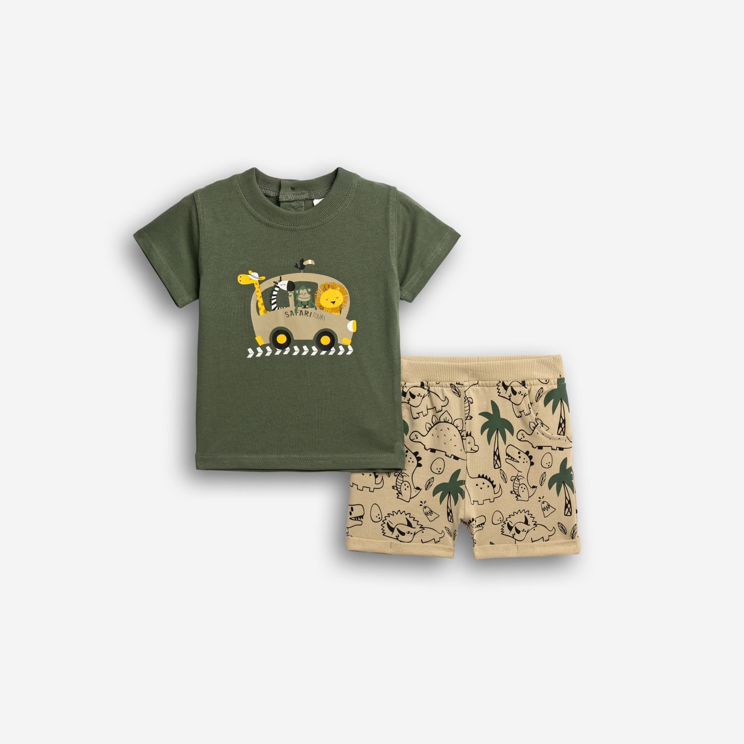 Σετ μπλούζα με τύπωμα (safari tours) και βερμούδα φούτερ με τύπωμα allover σε χρώμα χακί/μπέζ άμμου για αγόρι μηνών . Ποιότητα 100% cotton.