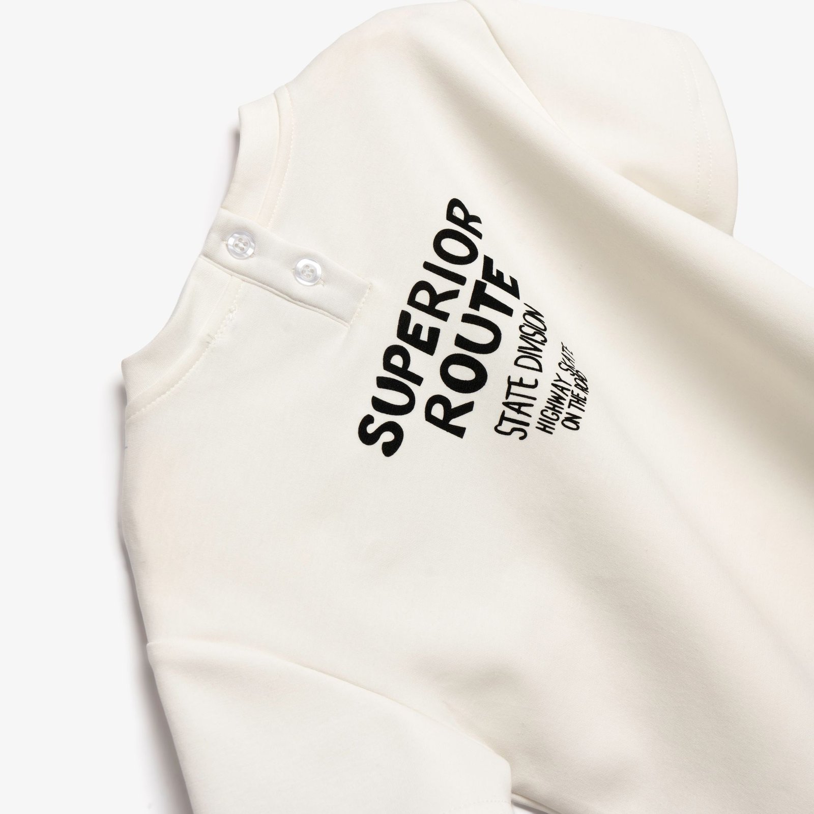 Σετ μπλούζα με τύπωμα (superior route) και βερμούδα φούτερ με τύπωμα και τσέπες σε χρώμα εκρού/εκρού για αγόρι μηνών . Ποιότητα 42% COTTON-53% POLYESTER-5% ELASTAN.