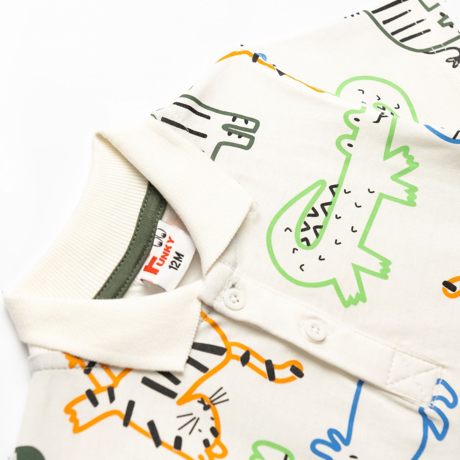 Σετ μπλούζα κοντομάνικη πόλο κάλτσα με τύπωμα (ζωάκια) και παντελόνι λύκρα σε χρώμα εκρού/χακί για αγόρι μηνών . Ποιότητα 100% COTTON+98% COTTON-2% ELASTAN