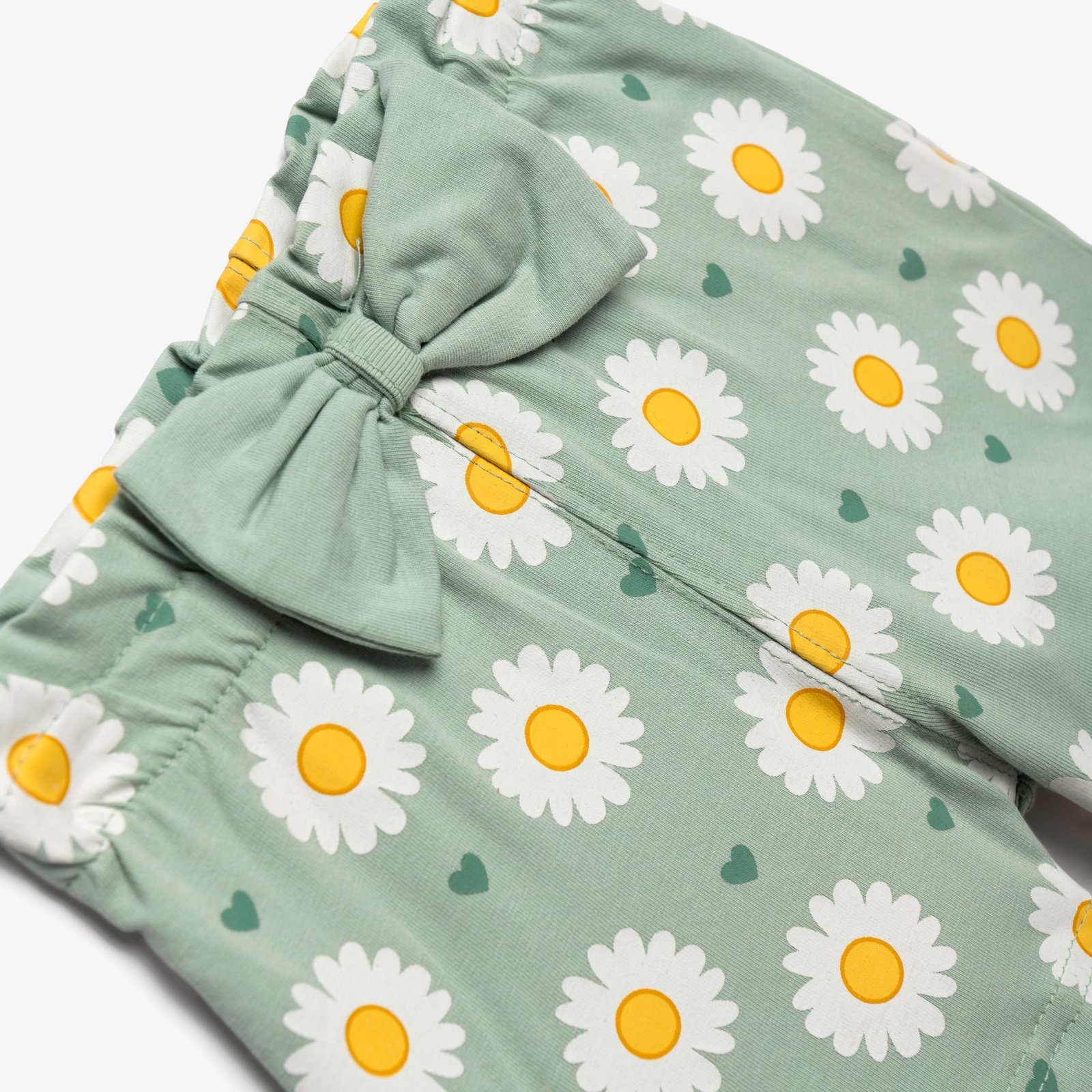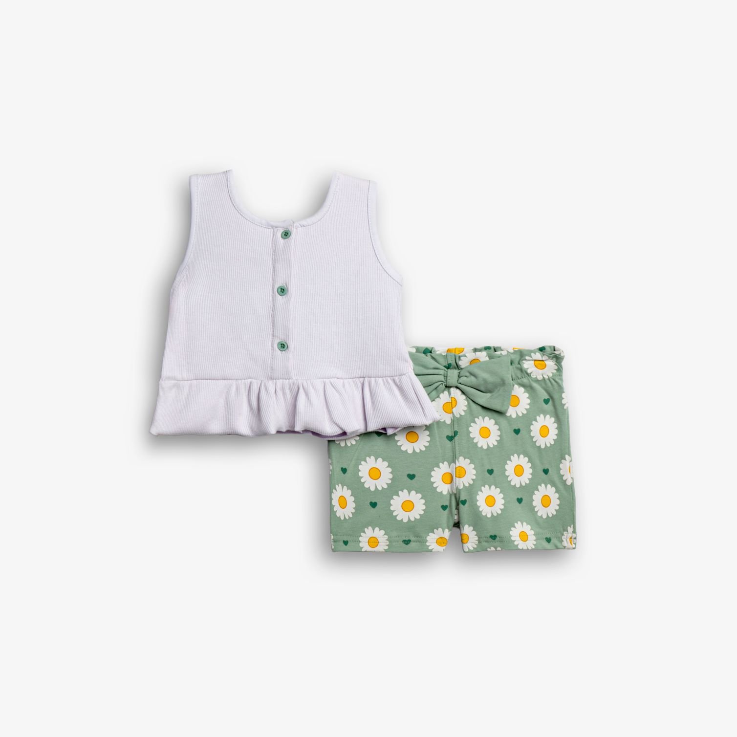 Σετ μπλουζάκι και σόρτς με τύπωμα (χαμομήλι) allover σε χρώμα λευκό/φυστικί για κορίτσι μηνών . Ποιότητα 95% COTTON-5% ELASTAN.
