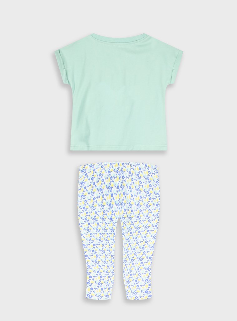 Σετ κοντομάνικη μπλούζα με τύπωμα και εμπριμέ κάπρι κολάν για κορίτσι . Ποιότητα ΜΠΛΟΥΖΑ 100% ΒΑΜΒΑΚΙ+ΚΟΛΑΝ 95% ΒΑΜΒΑΚΙ-5% ΕΛΑΣΤΑΝ.