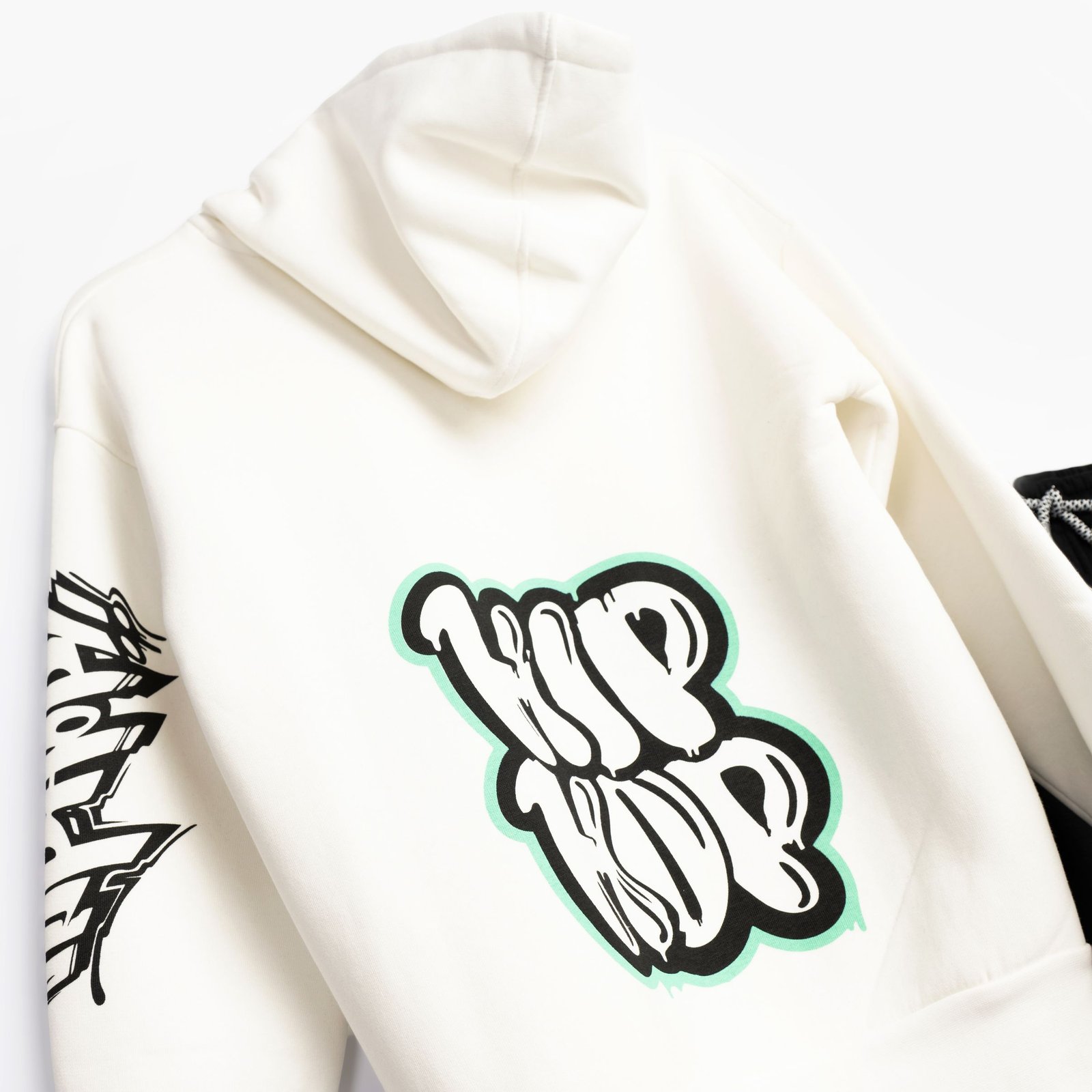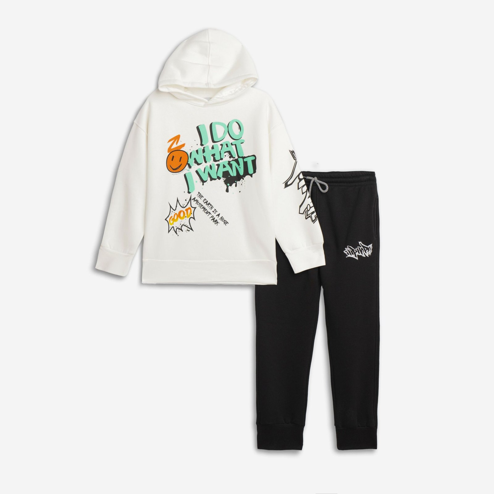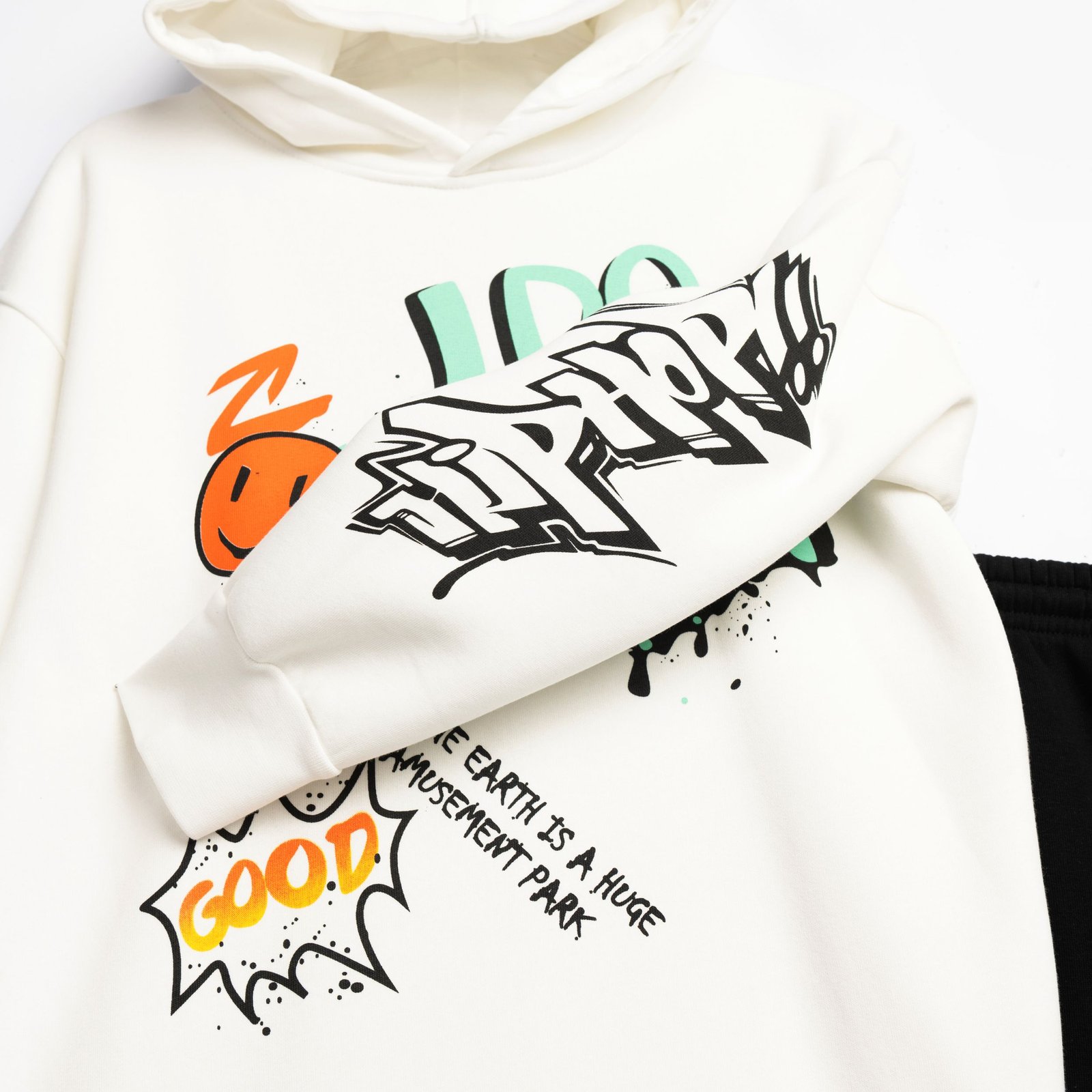 Φόρμα φούτερ με κουκούλα και τύπωμα στην μπλούζα για αγόρι 6-16 χρονών σε χρώμα εκρού/μαύρο. 65% COTTON-35% POLYESTER