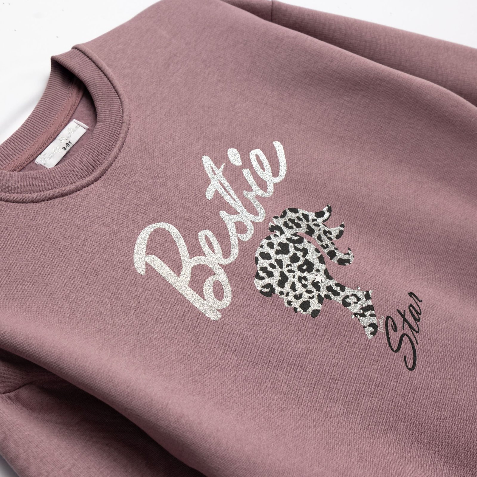 Φόρμα φούτερ με τύπωμα στην μπλουζα(bestie) και στο παντελόνι για κορίτσι 6-16 χρονών σε χρώμα σκούρο καμέλια/μαύρο. 60% COTTON-40% POLYESTER