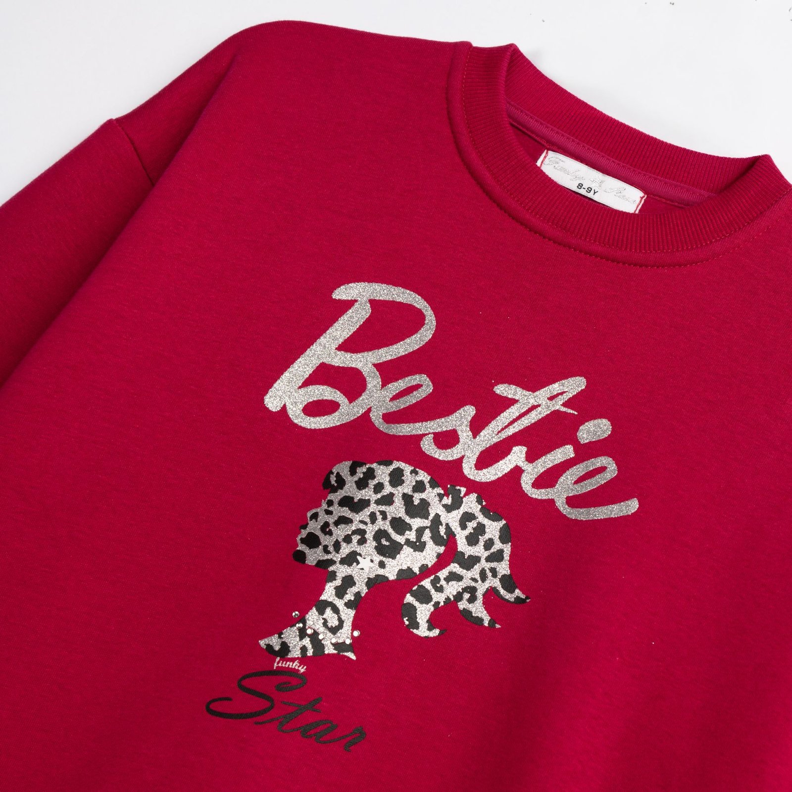 Φόρμα φούτερ με τύπωμα στην μπλουζα(bestie) και στο παντελόνι για κορίτσι 6-16 χρονών σε χρώμα σκούρο τριανταφυλλί/τριανταφυλλί. 60% COTTON-40% POLYESTER